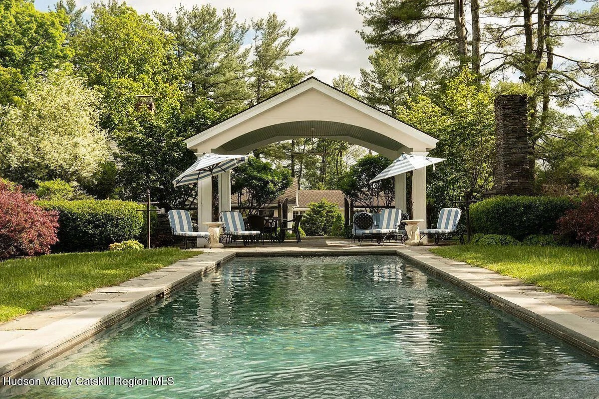 Inside on the first floor, there are four bedrooms and two bathrooms, with twin parlor rooms and a grand entryway, plus a sunroom and office. The kitchen features a Viking range, Sub-Zero fridge, and stone countertops. Three wood-burning fireplaces add to the ambience, and the second-floor suite includes custom cabinetry, and a bathroom with a soaking tub. Outside, a dining pavilion with built-in grill and fireplace complements an elegant lap pool. The lower level adds a gym, dog wash station, and two-car garage.