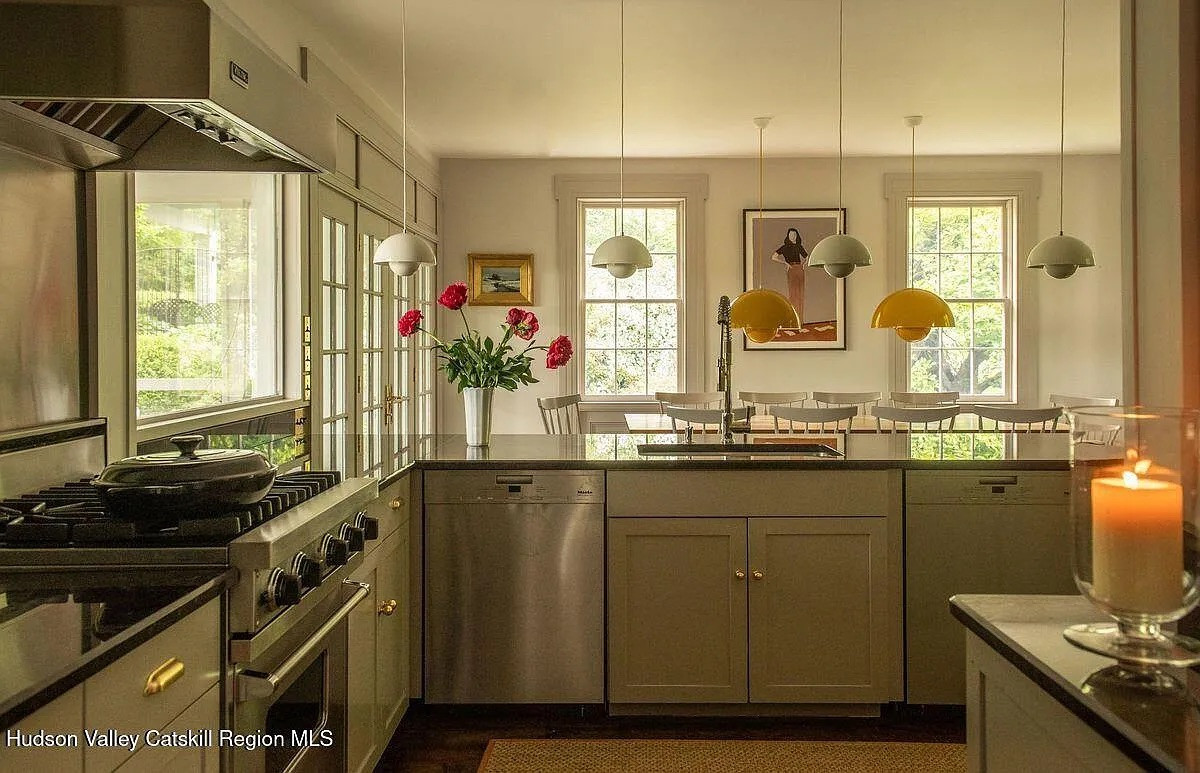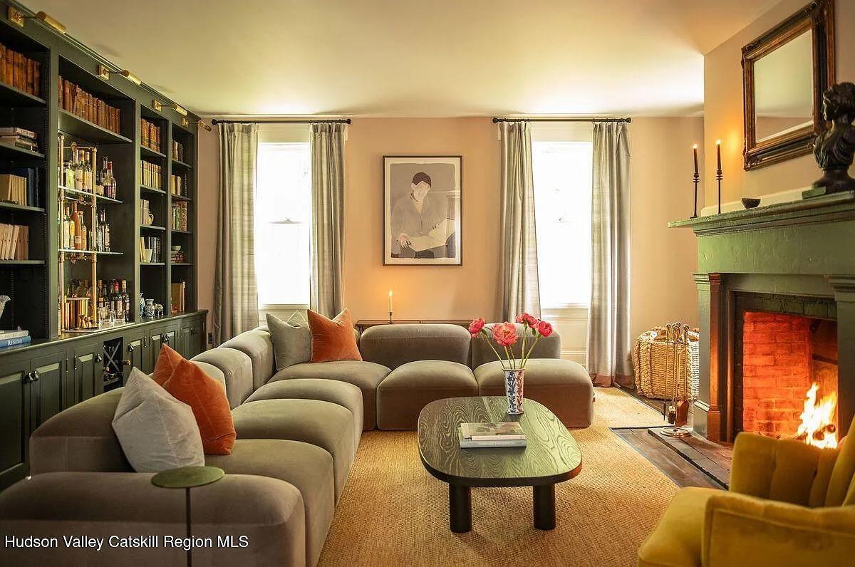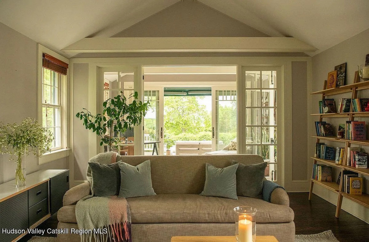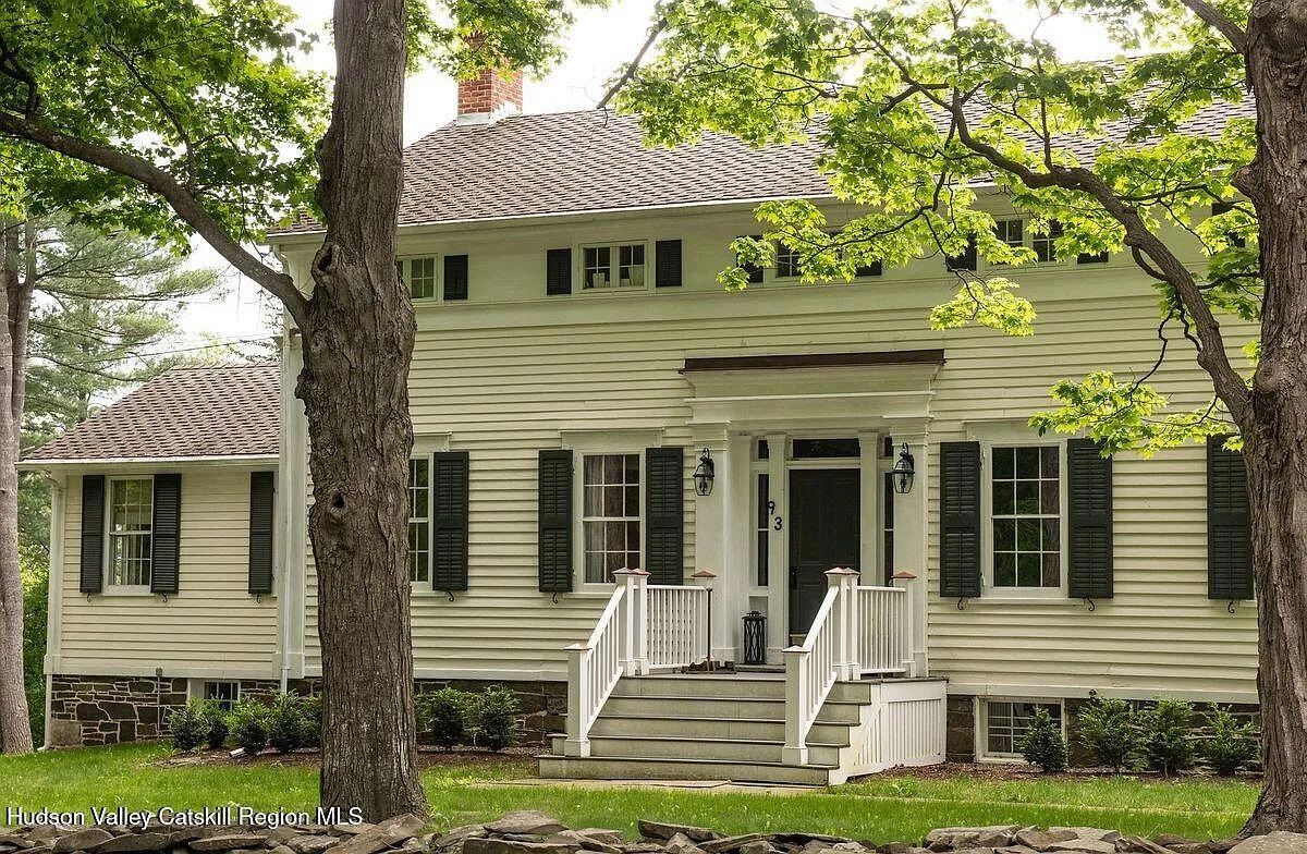 This is a Hudson Valley summer romance on 6.4 acres, on a quiet dead-end street with knockout views of the Catskills. 93 Old Mill Road in Ghent is a 3,240-square-foot 1820s farmhouse updated and expanded by Bill Stratton builders, with lilacs, hydrangeas, and peonies, old-growth trees, and low stone walls.