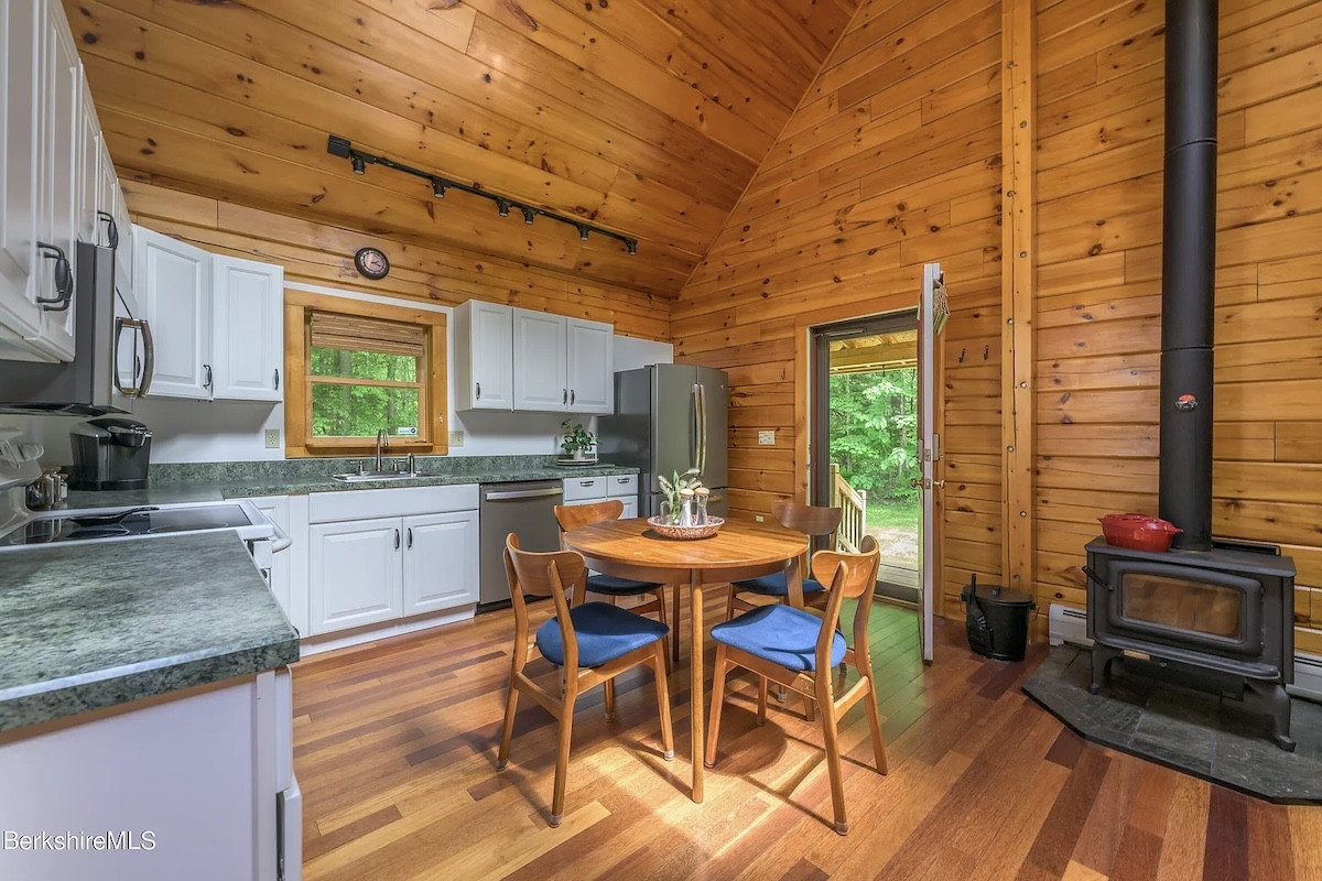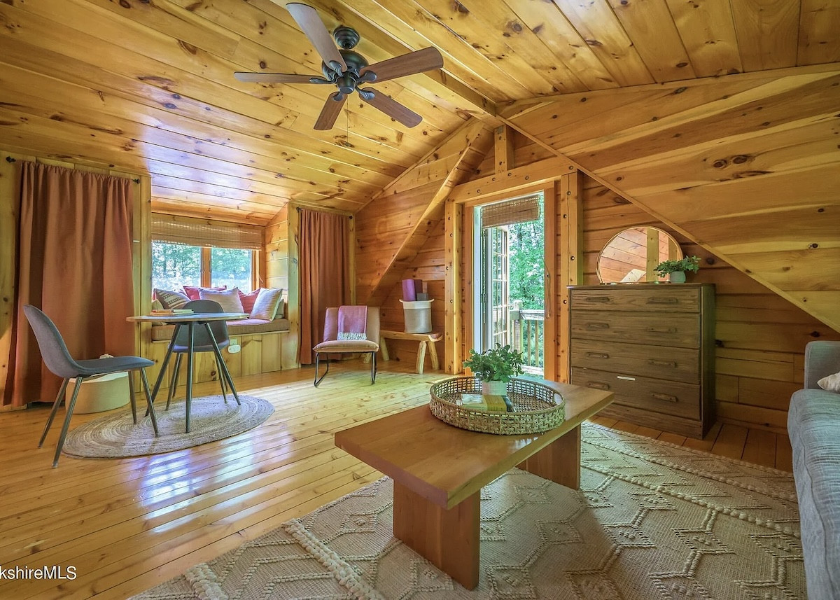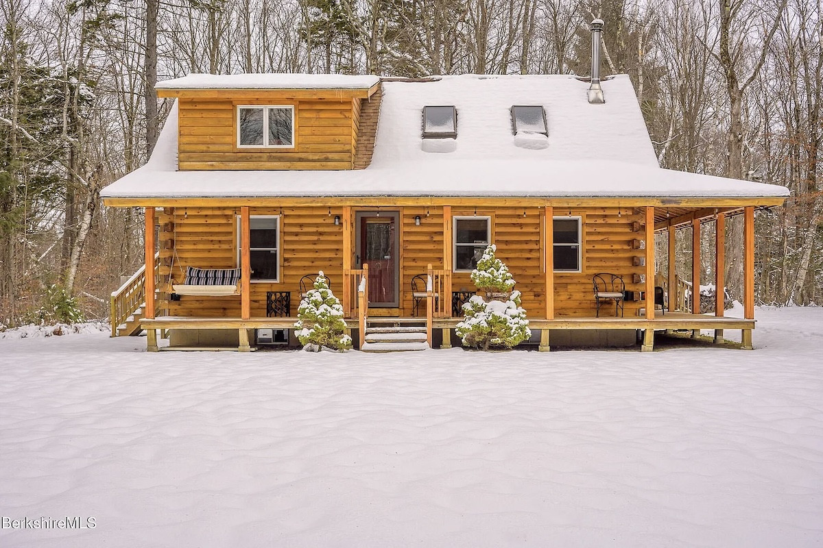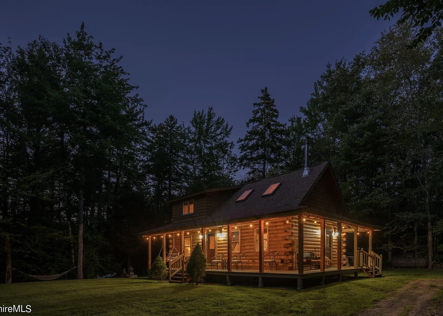 Amidst the rural landscapes of Washington, Massachusetts, 1202 Lovers Lane Road offers a harmonious blend of rustic charm and modern amenities. This 1,522-square-foot log cabin features an open floor plan that connects a cozy living room—complete with a wood-burning stove—to a fully equipped eat-in kitchen. The home comprises three bedrooms and two bathrooms, with the second-floor suite boasting a dedicated sitting or yoga area, an en-suite bathroom, and a secondary egress. Two additional first-floor bedrooms share a well-appointed bathroom, ensuring ample space for family and guests. Outside, a wraparound porch provides the perfect setting for morning coffee or evening sunsets. The property also boasts a strong rental history and comes fully furnished with high-quality items, making it a turnkey opportunity for prospective buyers.
