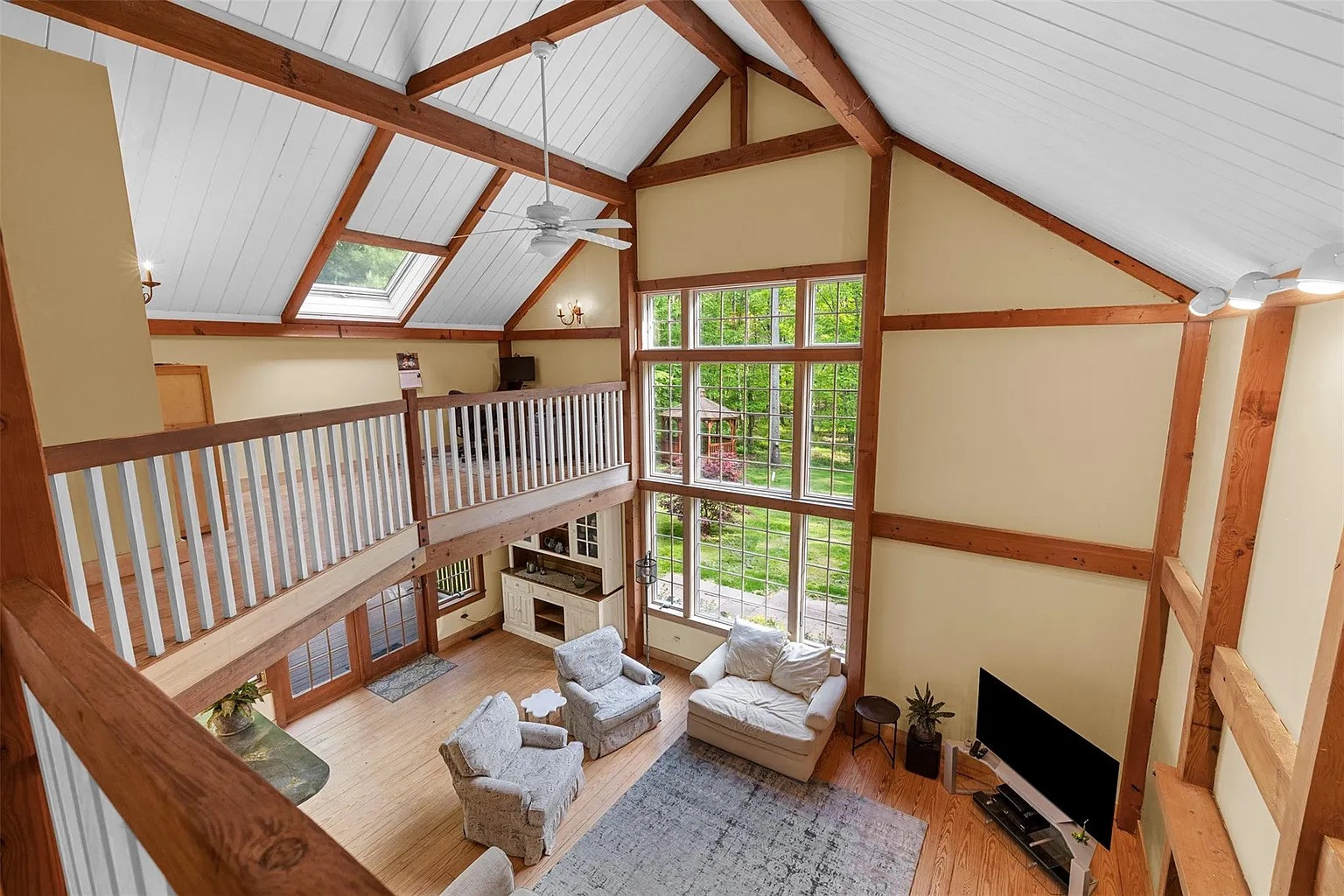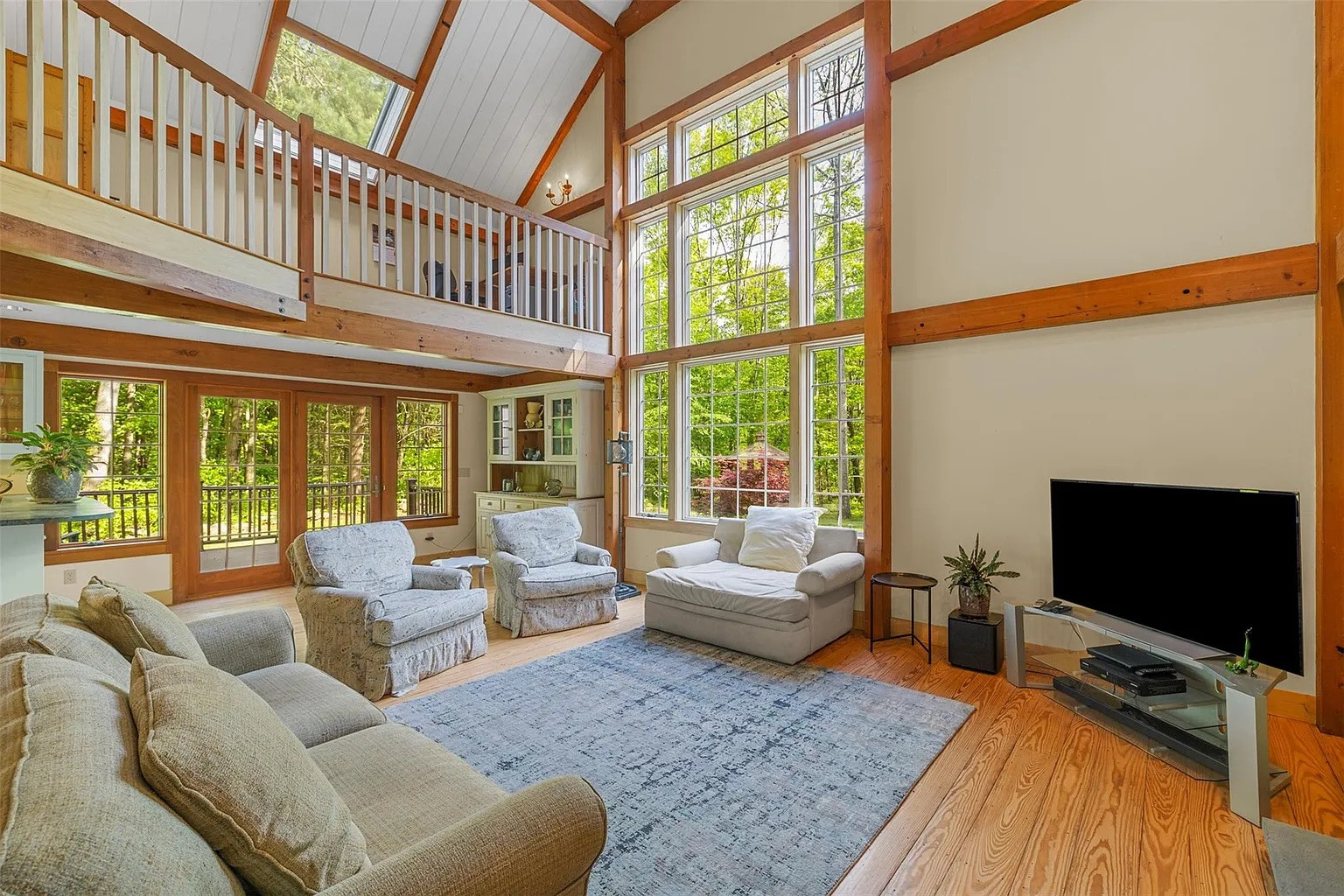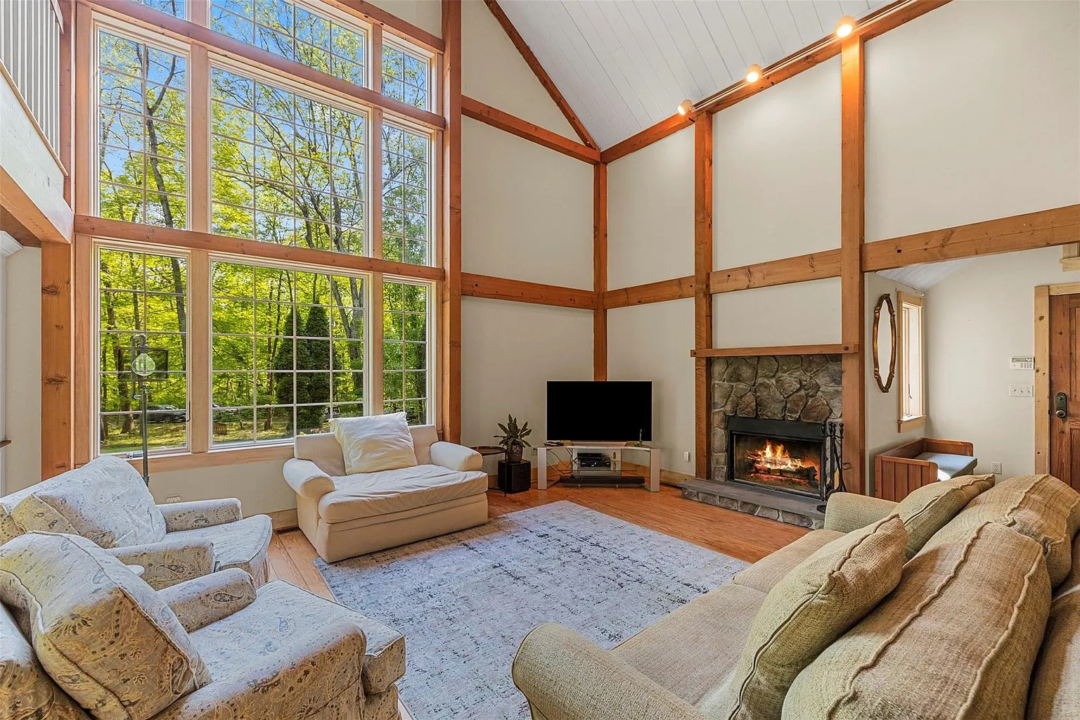 Built by Yankee Barn Homes, which makes custom sustainable houses of all architectural styles, 577 Fiddlers Bridge Road is an eco-friendly find in Staatsburgh. Built in 2003 on 4.5 acres, it's 2,572 square feet of rustic but refined charm, with vaulted ceilings, a wood-burning stone fireplace, and warm pine floors.