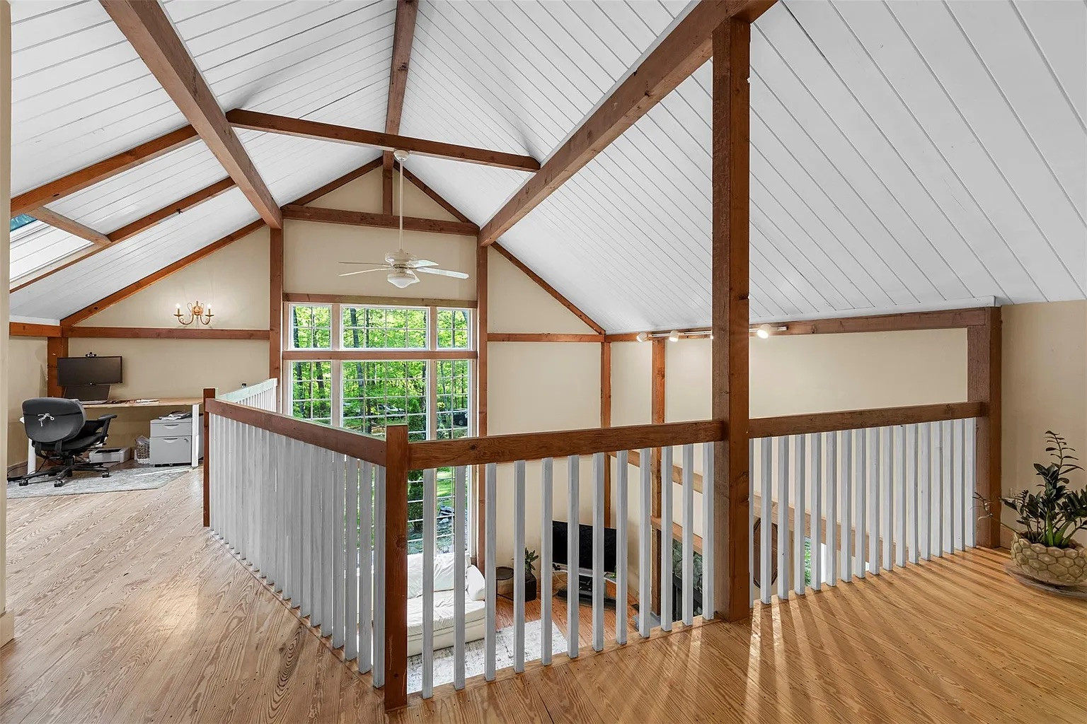 The home's interior centers around a large common area with a 23-foot ceiling, giving lots of light and from a huge window that spans nearly the entire building's height. The kitchen features Italian marble countertops and the upstairs has a balcony and two large bedrooms rooms with sloped, paneled ceilings and another full bathroom. A first-floor bedroom opens directly to the outdoors, with a home office space and full bath to complete the main floor.