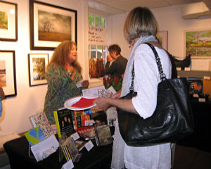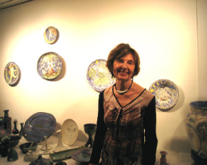 Liana Toscanini manages the pop-up shop during the cocktail reception; June Wink, an internationally known potter, in front of her work for sale.