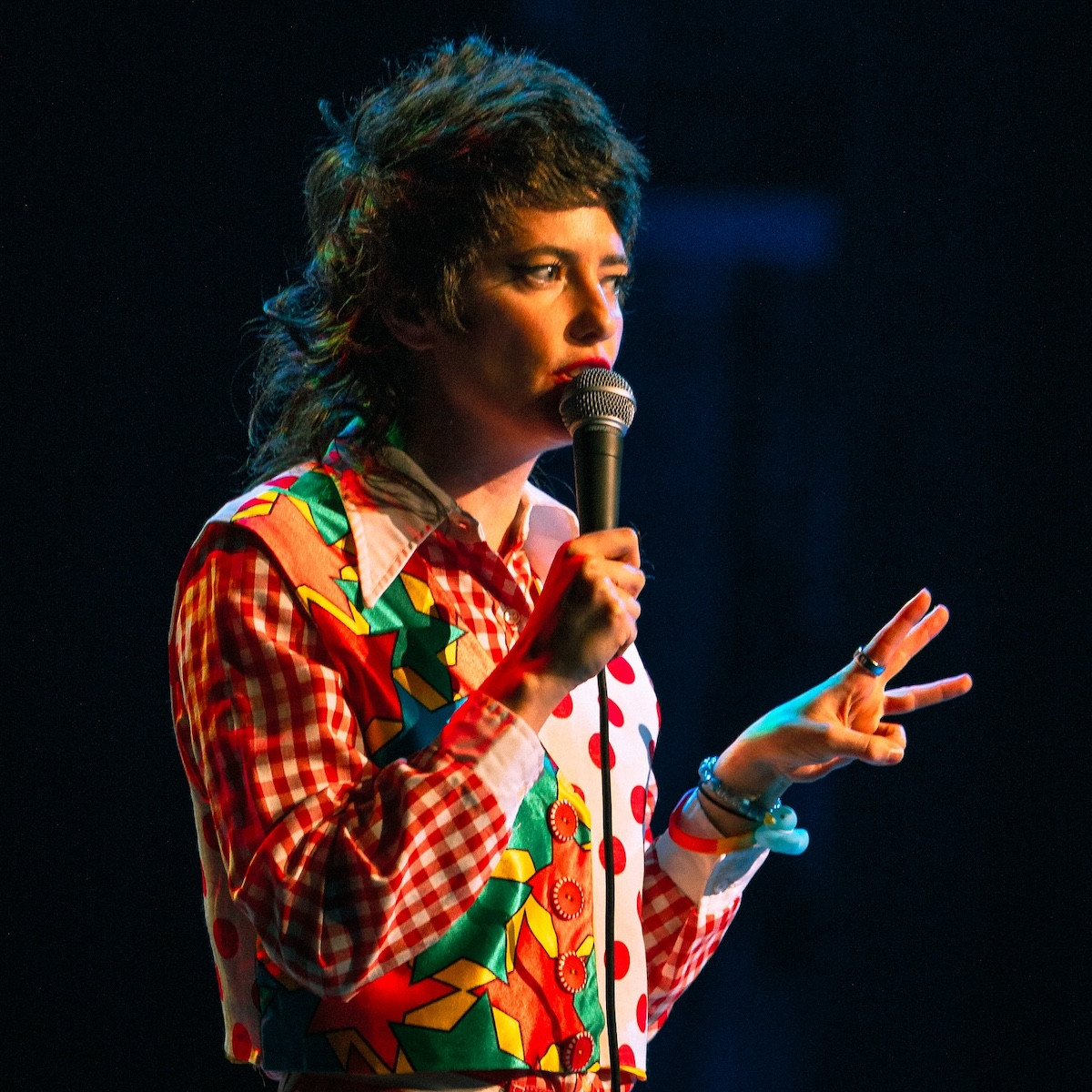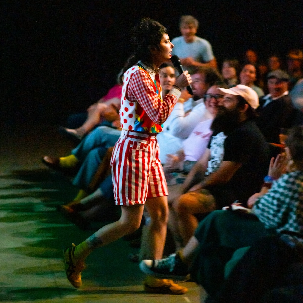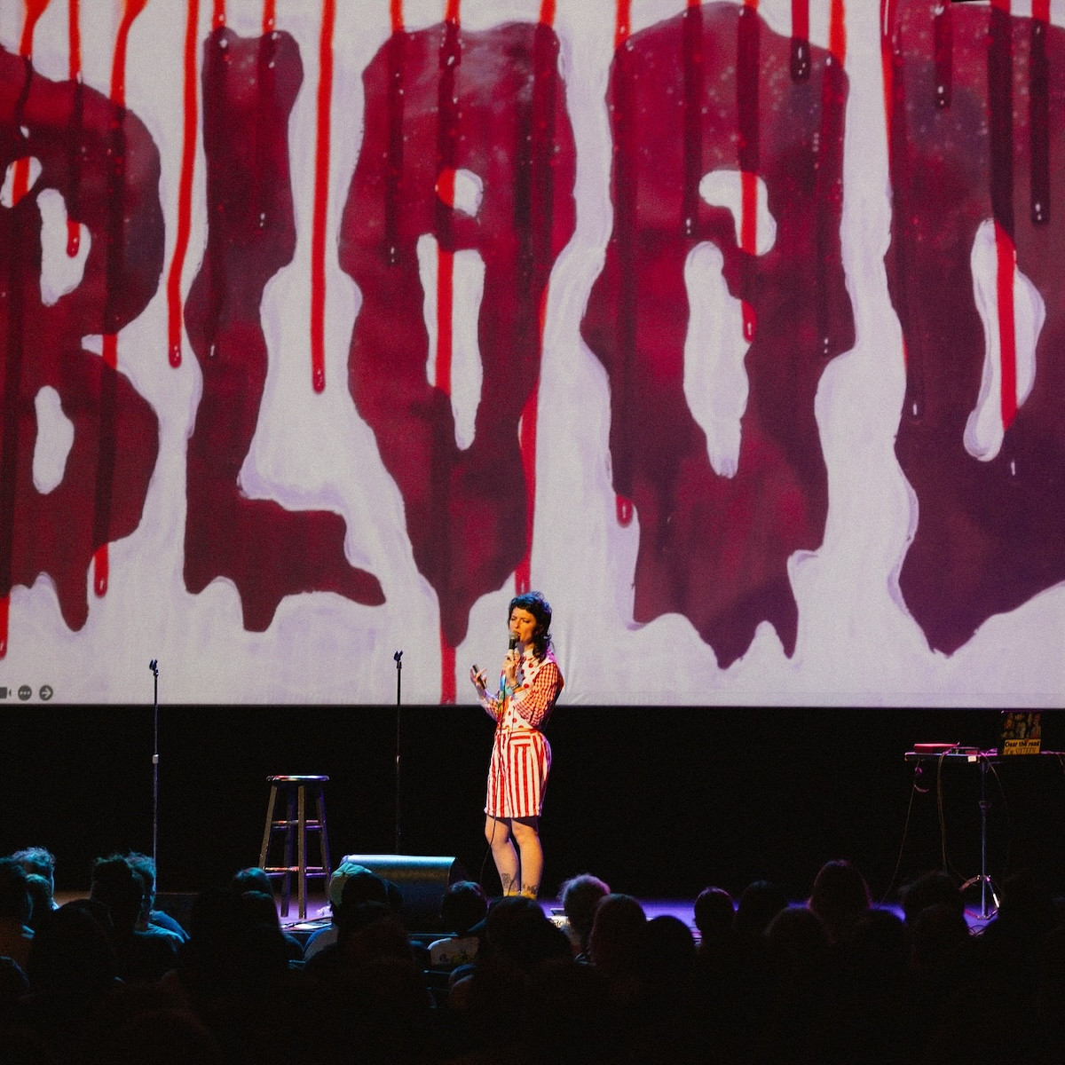 The intro set an intentionally toothless antagonistic tone but before anyone could get their bearings Sherman pranced off stage, ushering in local opener Marley Gotterer who took no time warming up before spilling her own guts about her recent gender-affirming surgeries. She also irreverently discussed her work as a counselor at a summer camp for “autistic, transgender, disabled kids.” The crass freedom with which she lovingly teased the campers felt like a clarifying statement about the notion that words don’t hurt marginalized communities, the intentions behind them do.