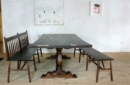 The pair first met after De Lisio moved back to our area. She’d grown up in Woodstock, but left for schooling and to live in the Southwest and California. Meyer, who designs Sawkille’s furniture, was raised in Pennsylvania, and he moved to the Catskills after graduating from the Rhode Island School of Design in 1993. Their collaboration began with Serv ce Station (without the ‘i’), a rural outpost in the Catskills that sold Meyer’s work as well as those by other artists, including De Lisio’s mother. “It was a balancing of our skill sets that made it possible to work together and our desire to create work for ourselves that supported a life we wanted to live. We each had something to offer and it made the situation a bit more whole,” De Lisio says. In 2010, the couple decided to home in on their furniture business. They rebranded their enterprise as Sawkille Co., and worked to translate Meyer’s sensibilities into more than just a few pieces at a time. They also moved their showroom and workshop into an inviting farmhouse-modern space in Rhinebeck, 5,000 square feet of old industrial space owned by Prandoni Design and Fabrication a.k.a. the “brilliant team” of brothers Stewart and Matt Verrilli who create Sawkille’s metalwork.