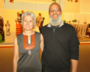 Amy Krzanik reports from Williamstown. Before studying in London, Los Angeles and New York City, and seeing his paintings hung in galleries around the world, artist Meleko Mokgosi graduated from Williams College in 2007. Therefore, his solo exhibition at the Williams College Museum of Art (WCMA), Lex and Love, can be seen as a sort of homecoming. The artist was on hand to speak to admirers at a spring celebration of three new shows at the museum on Thursday, March 16. Along with Mokgosi’s exhibit, which features two new chapters in his Democratic Intuition project, the event feted Robert Rauschenberg: Autobiography, which combines archival documents and original works and focuses on the artist himself; and Accession Number, which highlights pieces WCMA acquired from 1960 to 1962 and questions what the museum was given, why, and what work was prioritized or overlooked. [Above: WCMA director Christina Olsen and Meleko Mokgosi.]