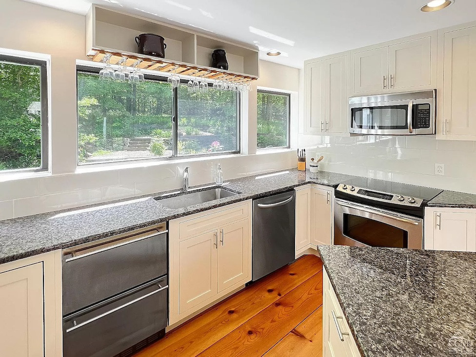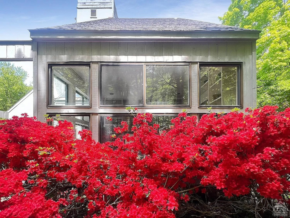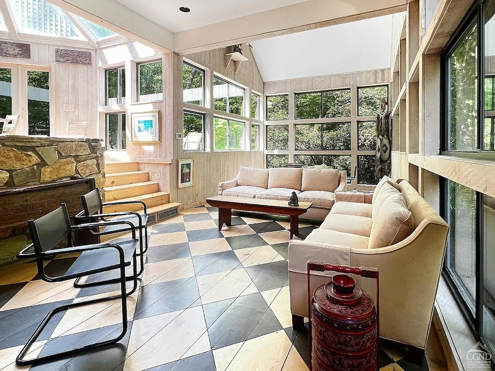 Built in 1981, this Hillsdale Contemporary features two bedrooms, each accompanied by full bathrooms, The living room offers a large stone wood-burning fireplace. Adjacent to the main house is a one-car garage with guest quarters that include a spacious living room downstairs and a private bedroom with a full bathroom upstairs. Among the 20 acres of property are manicured gardens. Listed at $954,000 bt The Meenagh Group.