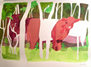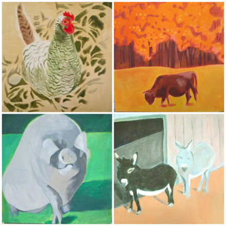 "Like everyone, I got interested in camouflage by reading How the Leopard Got His Spots," she says, referring to one of those wonderful illustrated Golden Books from the 1940 and 1950s based on the Rudyard Kipling Just So Stories. Barnyard animals are always the subject of Merrill's exhibits that coincide with the opening of the Village and its signature three-week event, Baby Animals on the Shaker Farm, a time when visitors turn out in droves to meet the newborn lambs, goats, chicks, ducks, piglets and calves. Merrill's previous shows have explored how animals move and cluster, how they eat, and how they "pose." While her work elevates and educates visitors, no recent theme brought up more anxiety for the artist than "Colors & Camouflage," which ratchets up the discussion to serious Darwin-esque levels, leaving both Merrill and her devotees to wonder how barnyard animals — presumably semi-domesticated — protect themselves from predators…or do they even need to? Merrill initially thought farm animals might be exempt (having fences, farmers and guard dogs to thank). Nevertheless, she thought it a worthy topic for this — her eighth — annual exhibit in the Poultry House Gallery. "The show is fun and colorful and every animal is truly known to Susan," says Lesley Herzberg, curator at Hancock Shaker Village.