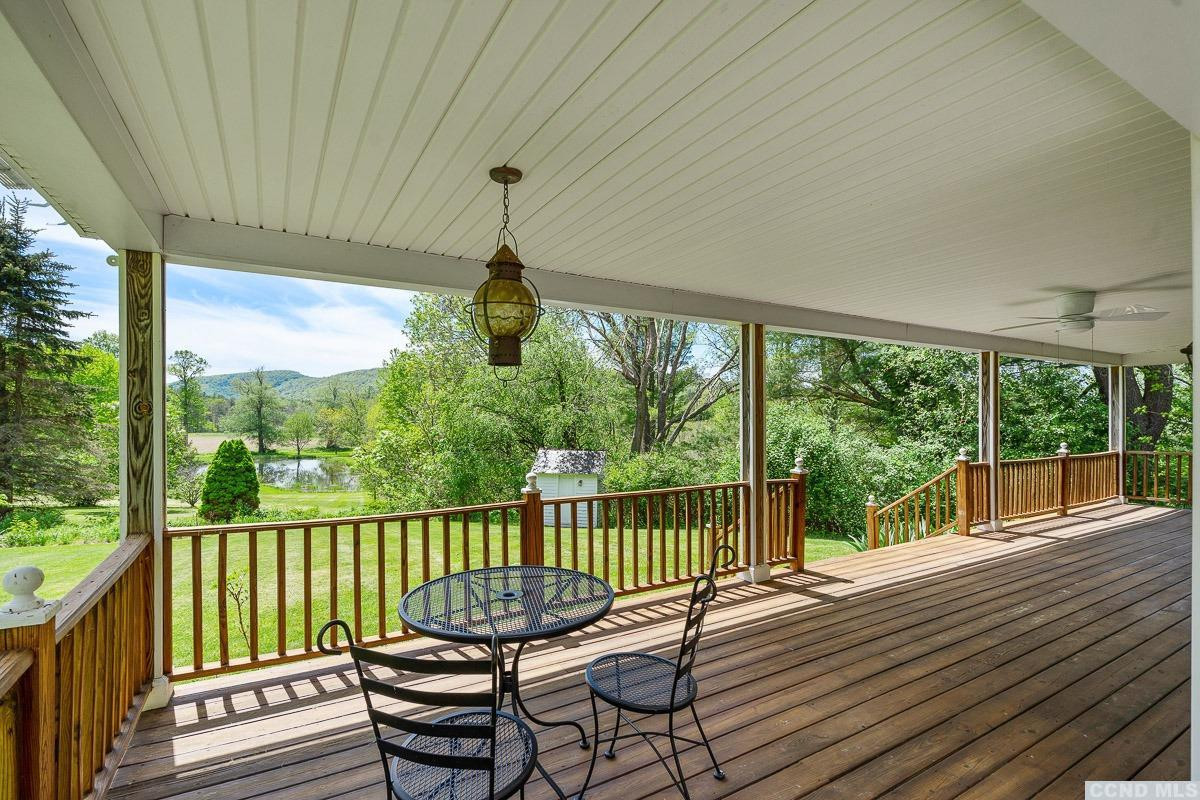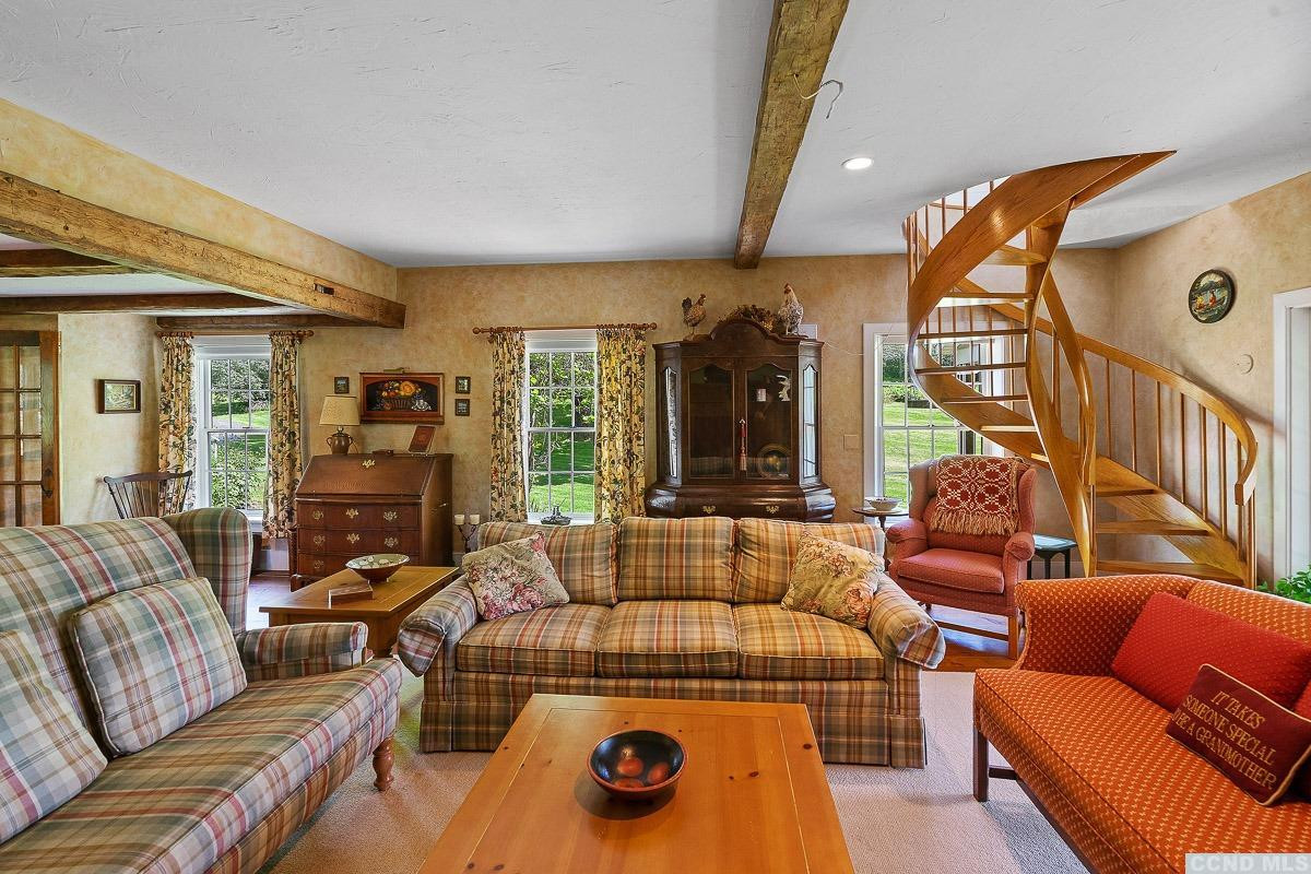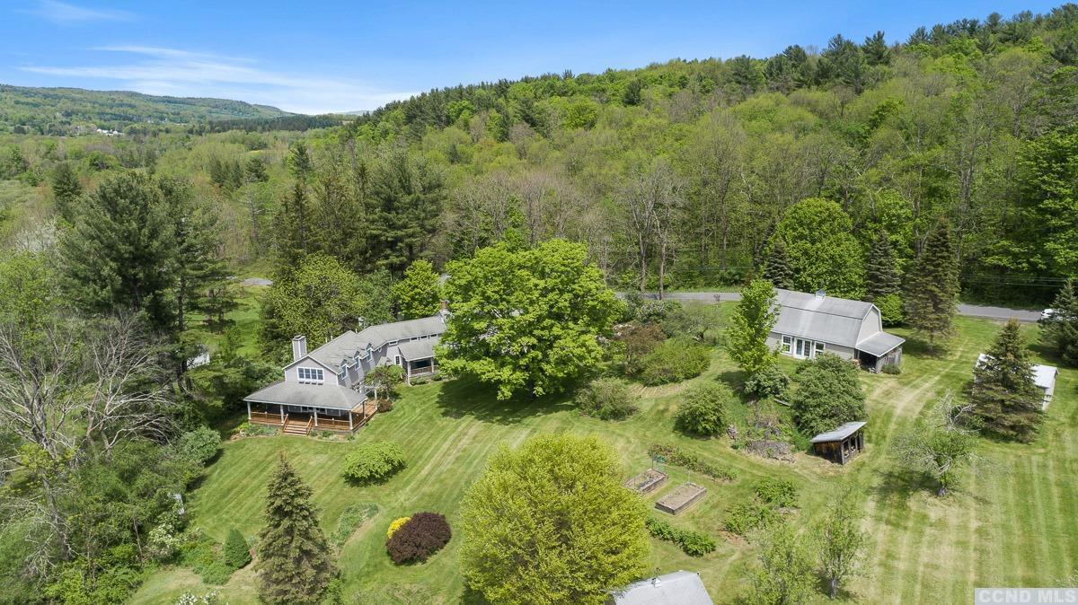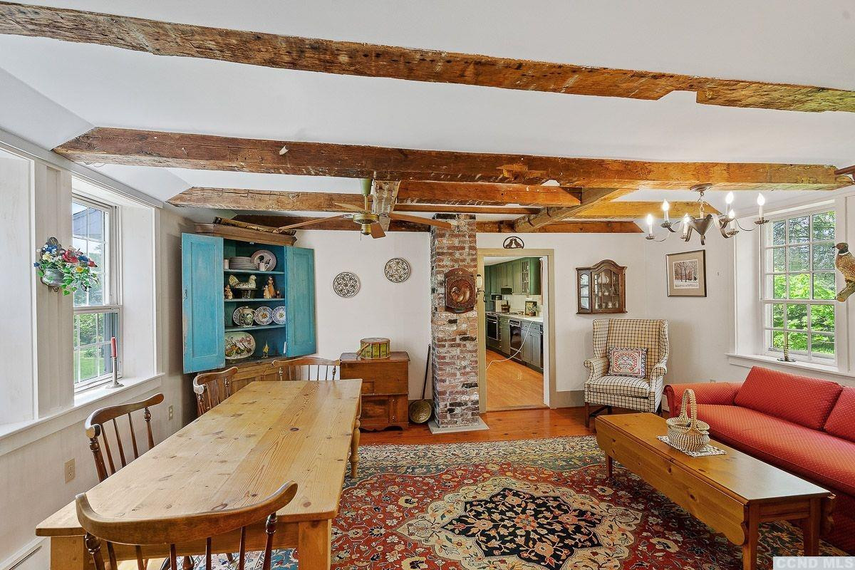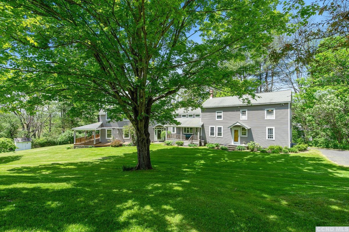 The 1790s Shaker-style home in New Lebanon more recently received an addition of 3660 square feet of living space. There are five bedrooms and five bathrooms, a great room, and stone fireplace. The large carriage house could serve as a guest space, studio or office. The 34-acre parcel offers southern views that overlook a large pond and garden. Listed at $849,900 by Coldwell Banker.