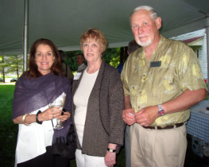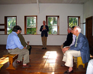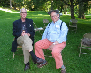 Stephanie Aeder and Paul Cassidy, a trustee, walk back from a closer look at the Great Stone Barn; Robert Kent and Greg Hickok enjoy the perfect solstice evening.