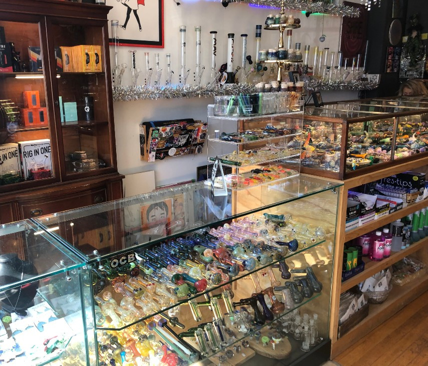 It's obvious that the huge collection of glass art pieces — bongs, bubble caps, cone rings, rigs, chillums, spoons — are made by highly skilled artists, most of them regional or local. The store also sells an impressive selection of rolling supplies, pipe cleaners and brushes, decorative rolling trays and vintage ash trays. But there’s more than cannabis paraphernalia here — handmade jewelry, plants and small furniture pieces crafted by a local woodworker, t-shirts and cannabis journals. Used books, too, which are some of the shop’s best-selling items.