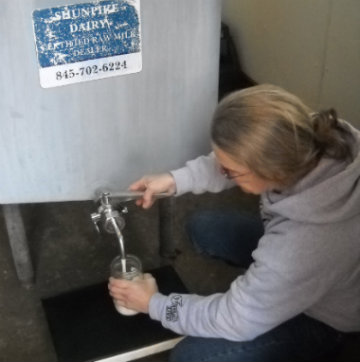 While the farm has been in the Baldwin family for almost 50 years — at one time it was known as Tonelwin Farm, an acronym derived from the family names of a former handyman — Baldwin ended her conventional dairying and started selling raw milk in 2010, when she received her New York State certification. It was economics, as well as the desire to produce a healthier product, that drove her into selling raw milk. The dairy, in the hamlet of Lithgow midway between Millbrook and Amenia, is situated in an area which was a major dairy farm center a hundred years ago. Today the farm is one of the few survivors, and by selling raw milk Baldwin can make a living from fewer cows. Selling (and buying) raw milk isn’t all that simple. Once a month, inspectors from New York State Agriculture and Markets visit the dairy to test samples for bacteria and antibiotics. (While Baldwin’s cows are not fed hormones or antibiotics, the milk is not “certified organic," which, she says, is a “whole different game.") All of the milk goes into a 100-gallon tank with a spigot at the bottom. By law, Baldwin explains, customers have to open the spigot themselves, she can’t do it for them, and it can’t be re-sold in supermarkets. The milk drawn from that spigot is fresh within a day or so. With the “sell by" date for grocery store milk lasting a week or more, the question becomes, how can anything that far removed from the cow's udder be nutritious? t’s not just the “pour your own" aspect that makes the Shunpike Dairy’s milk different from grocery store versions. The big (and somewhat controversial) distinction: “It’s not pasteurized," says Baldwin, as she gives a tour of the milking shed, dressed in a sweatshirt and muck boots. Pasteurized milk has been heated to 180 degrees, which many people believe destroys a lot of its nutrients. The milk also is not homogenized, which Baldwin says means spun in a centrifuge until the cream is disbursed through the milk. “If you let our milk sit in the bottle for a couple of days, the cream will rise to the top," she explains, just like in the old-fashioned milk bottles with a bulge at the neck to accommodate the cream.