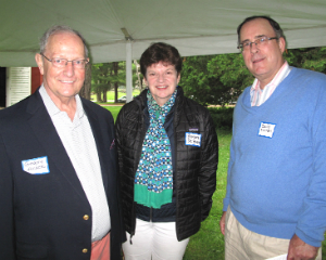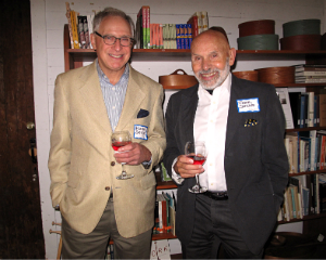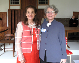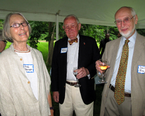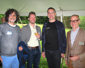 Amy Krzanik reports from New Lebanon. An intimate gathering of Shaker Museum | Mount Lebanon trustees, supporters and staff members attended an exclusive reception as the site’s newest exhibition was unveiled in the Wash House ironing room. Side By Side: Shaker and Modern Design, curated by Jeff Daly, displays 19th-century Shaker furniture alongside modern equivalents to show how the simple and direct forms of Shaker craftsmanship has inspired modern makers, most notably furniture designers of the “Danish modern" era. Guests chatted inside the Wash House and gift shop and outside underneath a tent to keep out of the drizzle and snacked on savory appetizers from local gem, Blueberry Hill Market Café. Dinner in local homes followed the reception. Side By Side will be on display until October 12, and another new exhibit, The Small World of Shaker: Miniature Furniture, Books & Dolls is set to open on July 19. Shown above, photographer Michael Floman, Michael Carter, trustee Paul Cassidy and Museum President David Stocks.