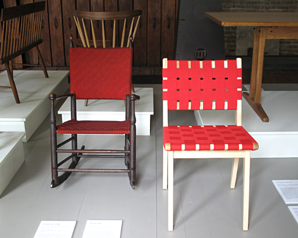 Two chairs sit side by side, the one on the left a Shaker example and the one on the right a modern design taking inspiration from the former.