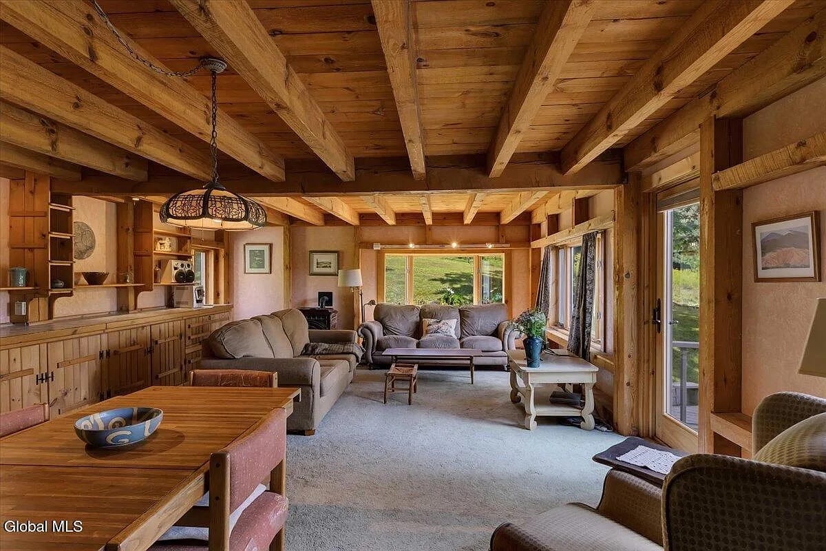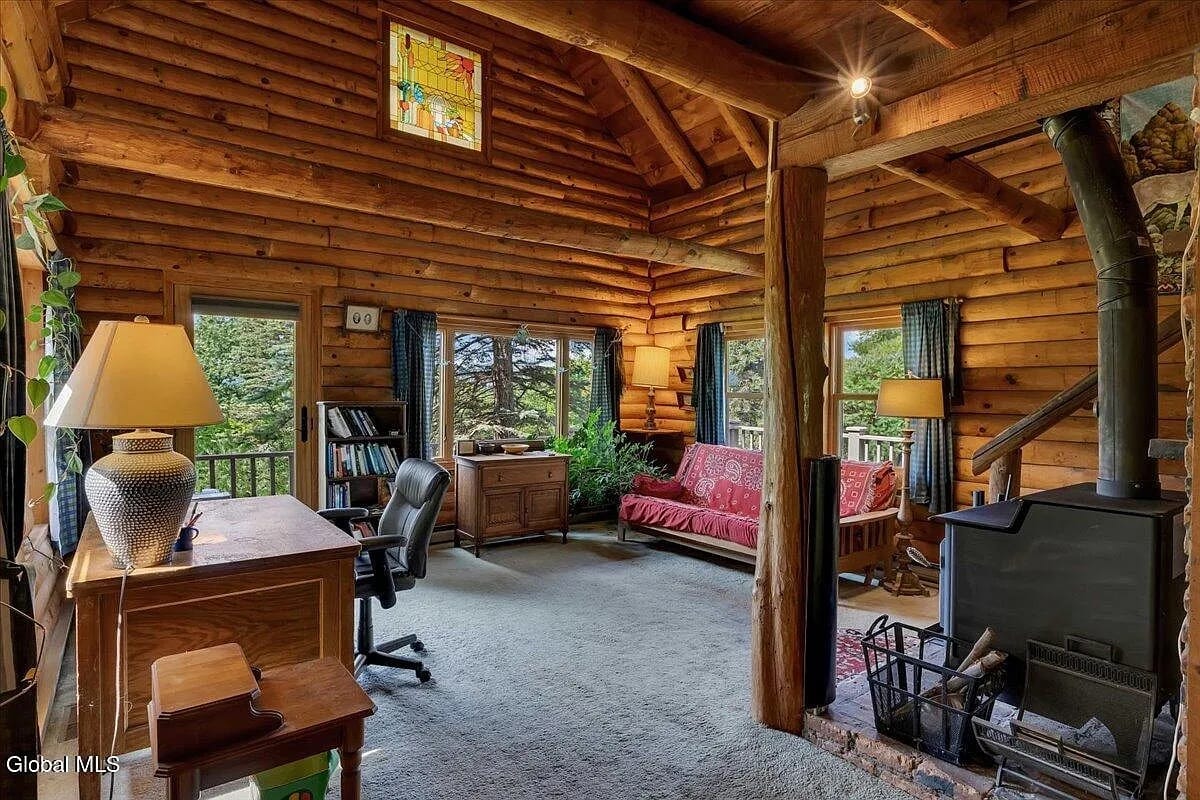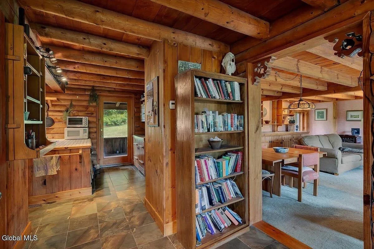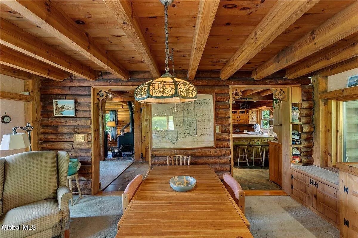 Here’s a rustic cabin with modern updates about 10 minutes from Jiminy Peak. 388 East Road sits on 8 acres in Stephentown, in the woods and of them: this is a log and post-and-beam home built in 1975 that encapsulates vintage chalet style. Even the kitchen is rough-hewn.