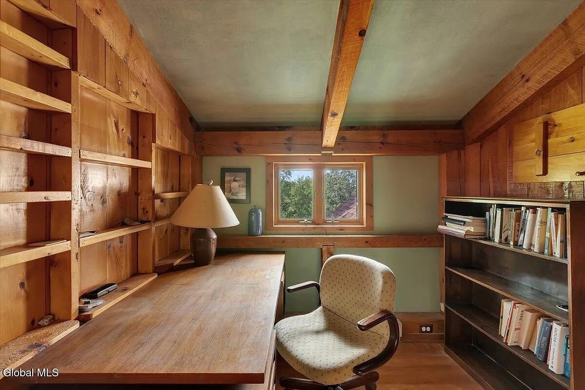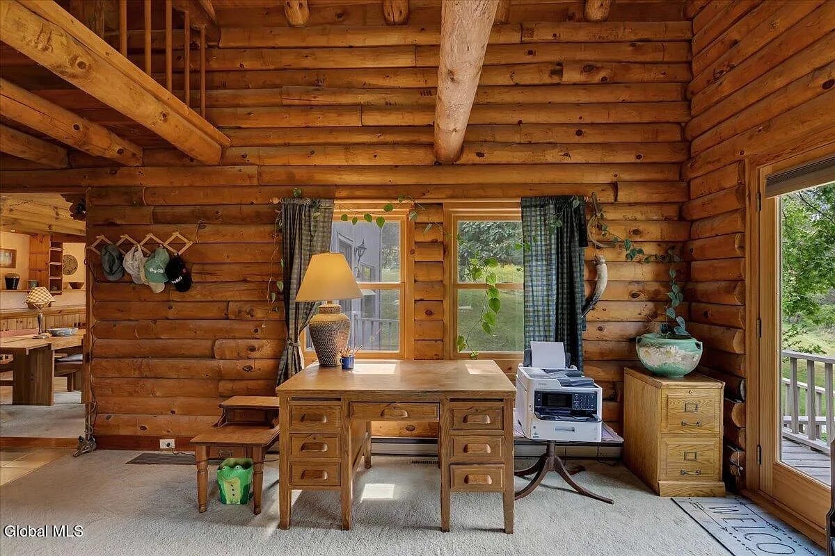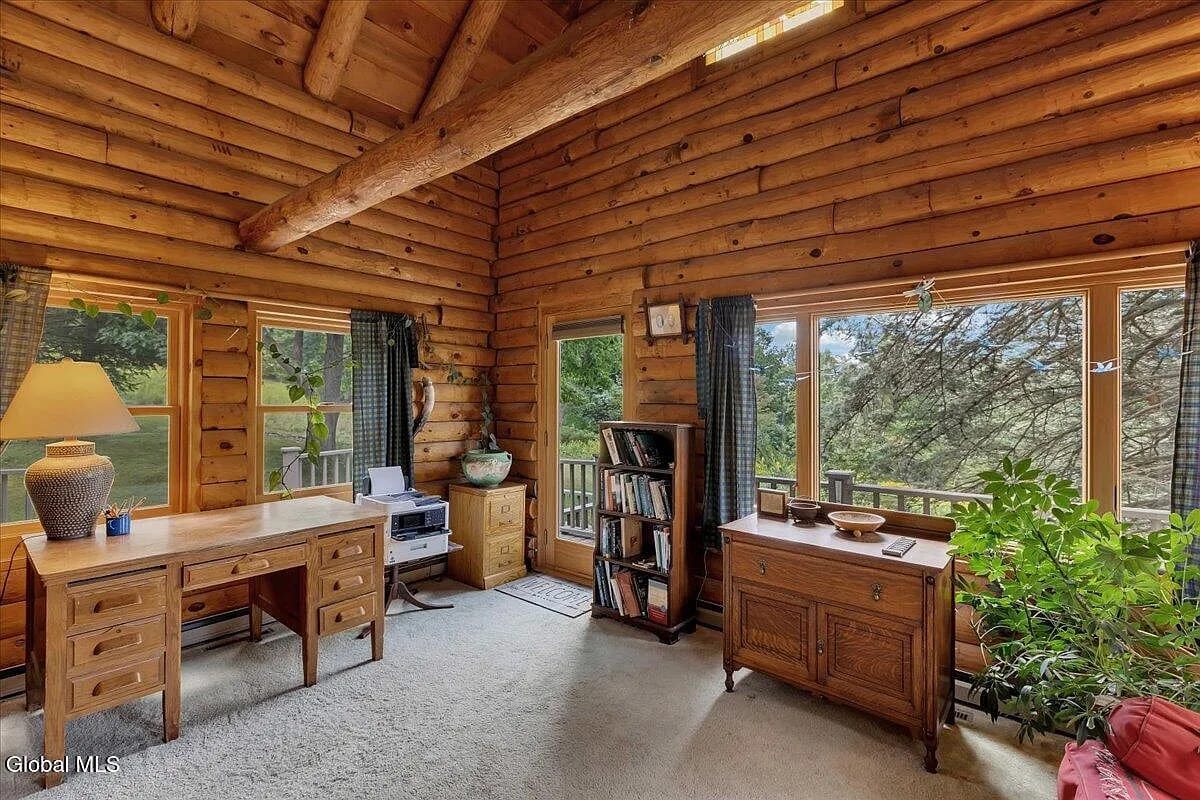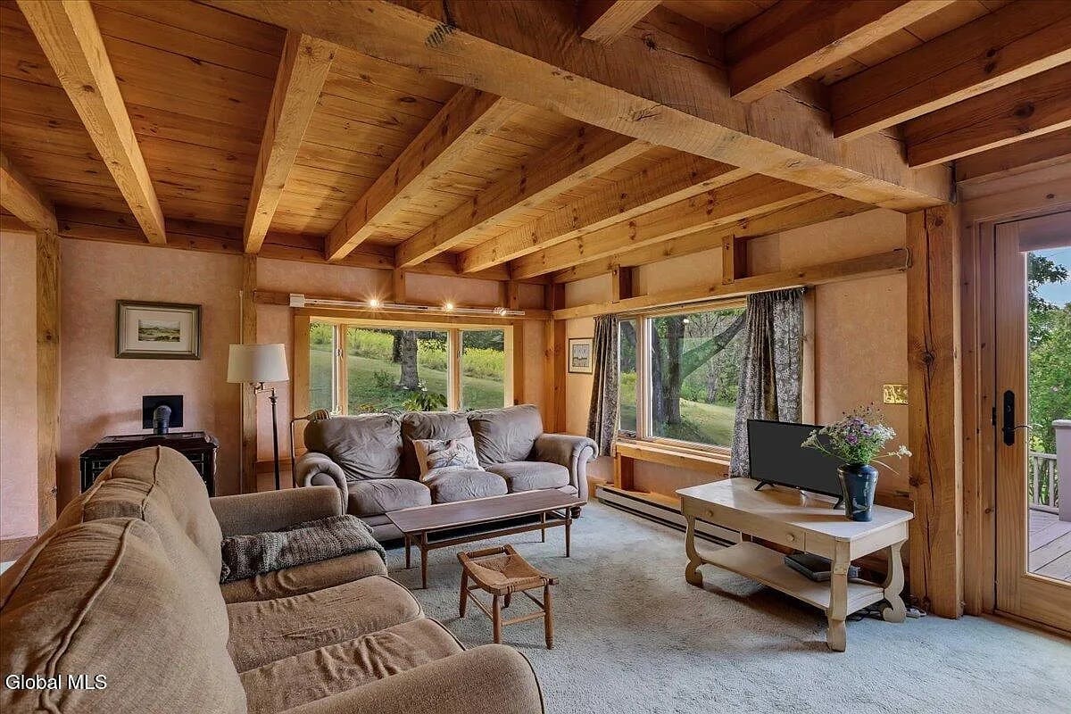 Here’s a rustic cabin with modern updates about 10 minutes from Jiminy Peak. 388 East Road sits on 8 acres in Stephentown, in the woods and of them: this is a log and post-and-beam home built in 1975 that encapsulates vintage chalet style. Even the kitchen is rough-hewn.