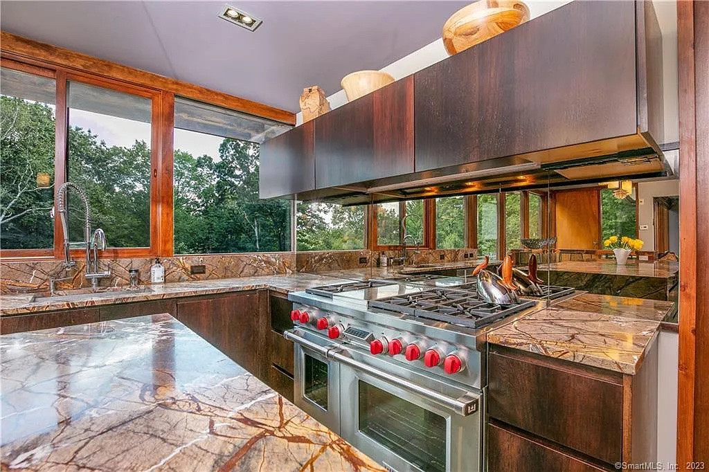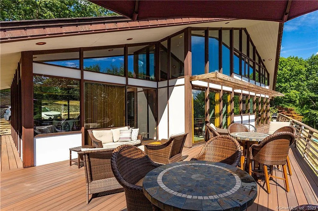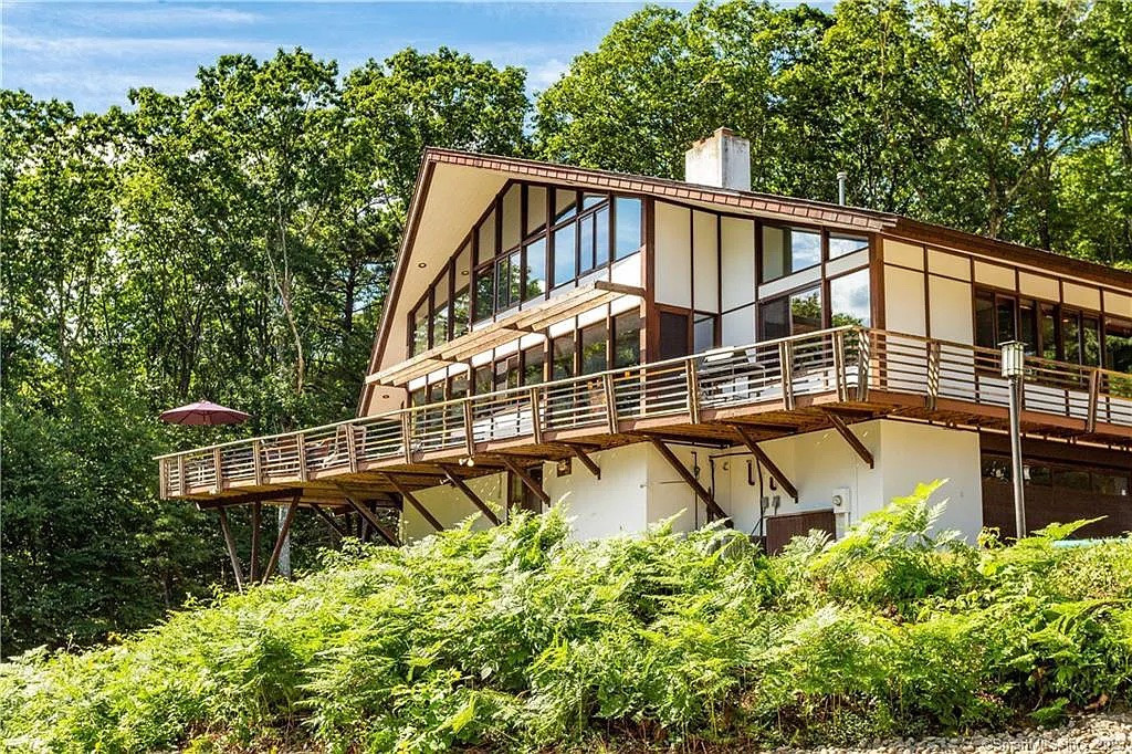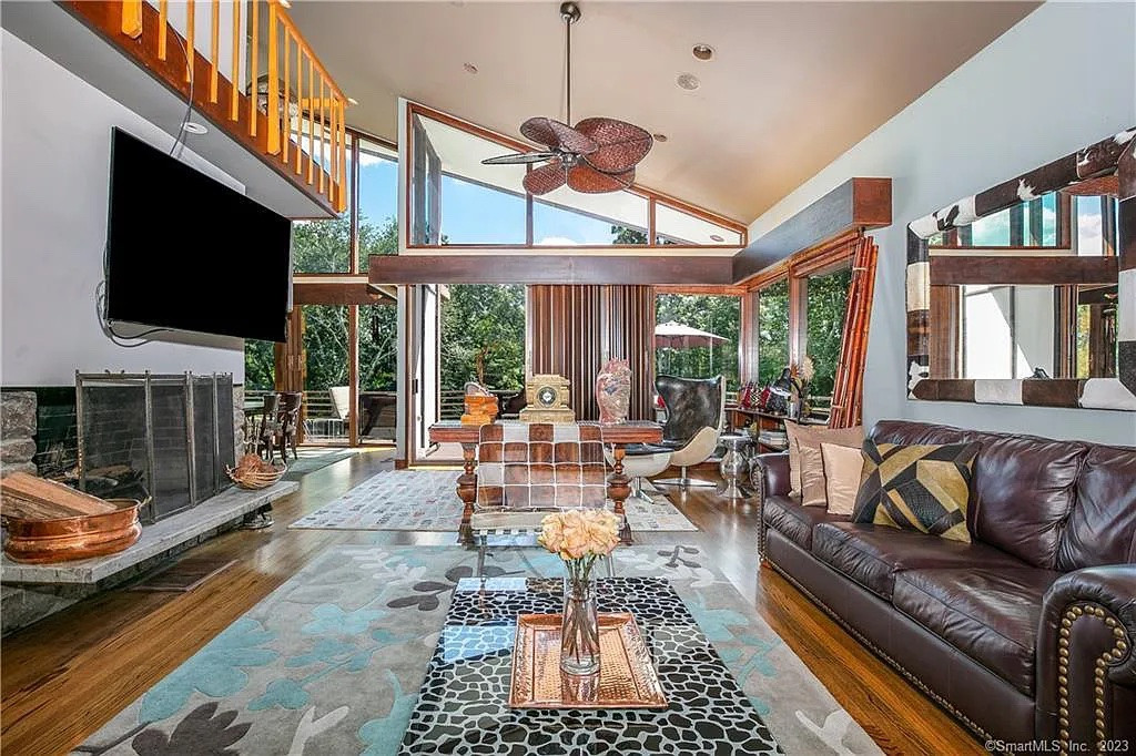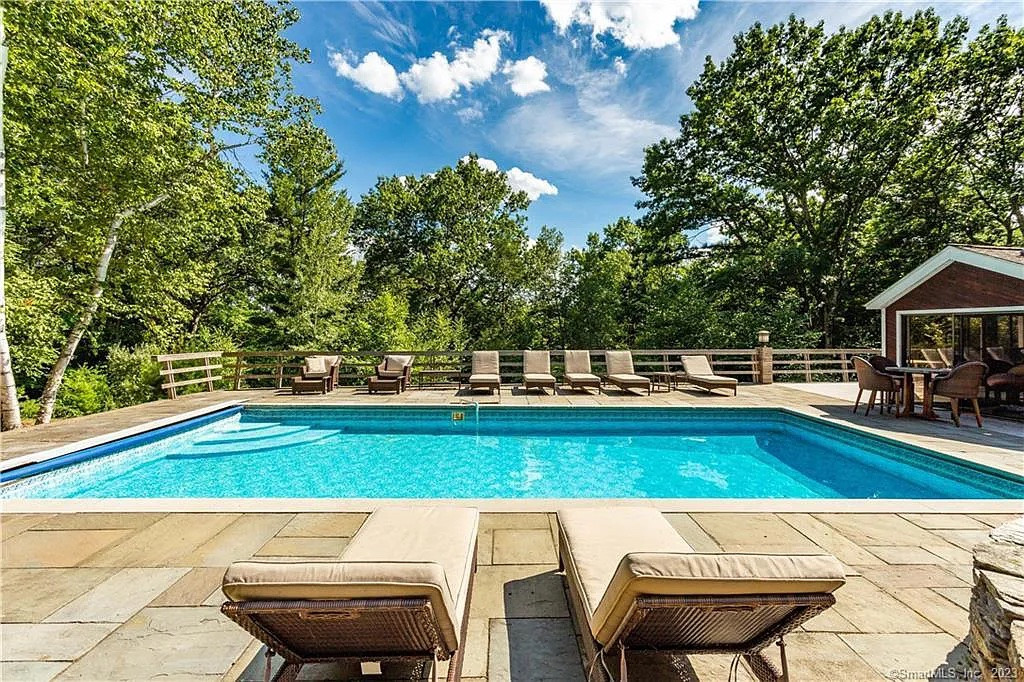 With nearly 4,000 square feet, five bedrooms and five bathrooms, this Contemporary in Litchfield is set on over seven acres. Its exapnsive windows and wraparound deck offer lots of natural light. The living room features high ceilings and the dining room has two-story windows. The lower level includes a bedroom, kitchen, family room and a fireplace. Walk through a stone path to the heated pool and a cabana. Listed at $995,000 by William Pitt Julia B Fee Sotheby's International Realty.