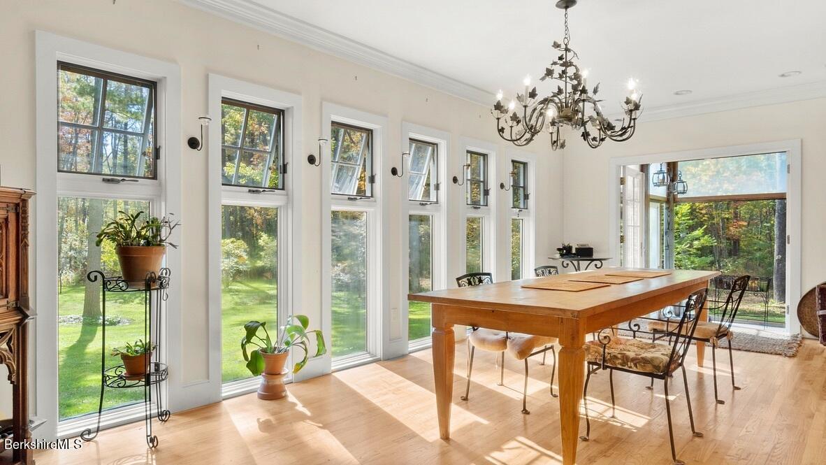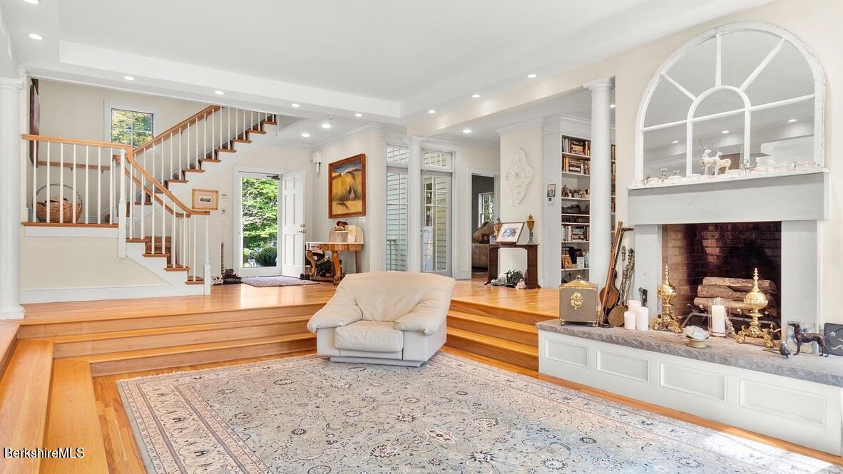 Set on 10-plus acres with deeded Stockbridge Bowl lake access, this large Contemporary has four bedrooms and four bathrooms.The first floor has a living room with fireplace, library with built-ins and a great room with cathedral ceilings and a loft. The bedrooms (one with a loft kids will love) are upstairs along with an upstairs laundry. It's close to Tanglewood and downtown Lenox. Listed at $1,500,000 by Berkshire Property Agents.
