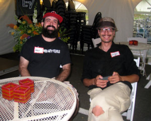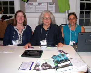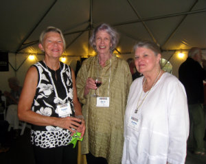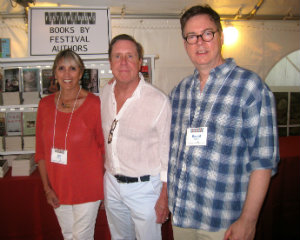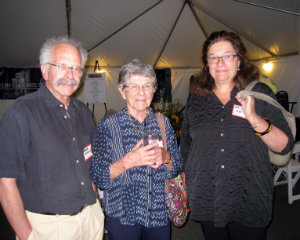 Lisa Green reports from Spencertown. There were hors d’oeuvres and wine under the tent to commence the preview party for Spencertown Academy of Arts Center’s Festival of Books. But let’s be honest: everyone was there for first crack at the book sale. The Labor Day weekend festival is more than sale alone, however. The display of books just behind the wine bottles foretold of authors scheduled to speak in the following days, including Rural Intelligence familiars Simon Winchester and Ruth Reichl as well as historian and Williamstown resident Alex Kershaw, author of Avenue of Spies and Talia Carner, author of Hotel Moscow. Now completely volunteer driven, the Academy draws on the tireless efforts of volunteers to produce the festival, and proceeds from the event will go to fund the many art activities that the Academy hosts every year. [Above, Jill Kalotay and David Highfill, festival co-chairs, flank Nick Van Alstine, president of the board of directors.]
