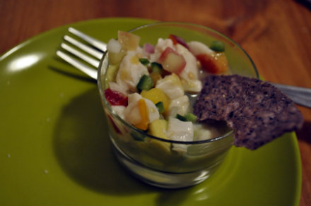 Spicy Scallop Ceviche 3/4 lb fresh bay scallops 1 peach 1 jalepeño 1 red onion 1 cup cherry tomatoes 1 avocado 1 lime Salt to taste Tortilla or plantain chips, for serving Dice all fruit and veggies into small cubes; reserve the lime. (Scrape the cherry tomatoes of their seeds and juice, as much as possible.) Place them in a bowl and cut the lime in half and squeeze all its juice over the diced veggies. Cut the scallops into small cubes and add to the mixture; mix well, ensuring that the scallops are covered with lime juice. Add salt and cover; refrigerate for at least two hours. The scallops will go from being a kind of translucent beige to a very opaque white when ready. Serve with chips.
