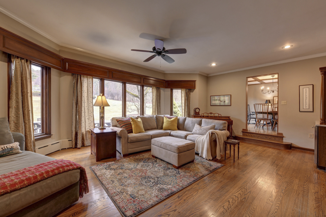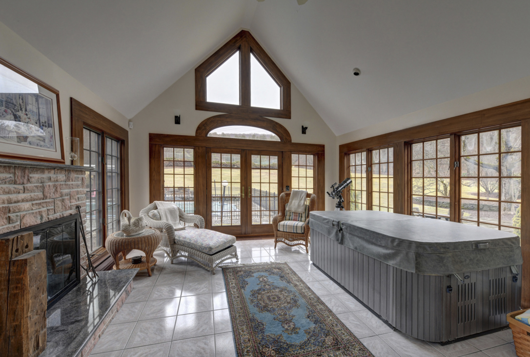 This Tudor-style home in Dalton sits on 25 private acres that include a swimming pool, bluestone patio, and tennis court. The home has four bedrooms and three bathrooms, a living room with a wood-burning stove and wet bar, a formal dining room, a kitchen with a gas fireplace, master suite with a walk-in closet, master bath and private sun room with a hot tub and fireplace; an office, and a laundry room. The property is close to cultural venues, restaurants, and shops. Listed for $625,000 by William Pitt.