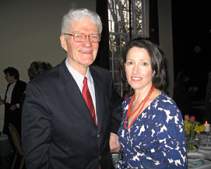 Lisa Green reports from Sandisfield. From a Baptist meeting house to an Orthodox synagogue to the Sandisfield Arts Center, a building tucked away in Sandisfield has served the needs of its community since 1839. On Saturday, April 12, Sandisfieldians celebrated the rehabilitated building’s 175th birthday with the Spring Fling Dinner and Benefit Auction. “We’re proud of where we have come and are committed to the future," said the Sandisfield Arts Center’s current Co-President Susie Crofut (shown, near right, with friend Kathryn Clarke). Sandisfield is an isolated town with no town center, she continued, but it now buzzes with jazz, folk and classical concerts, literary events and children’s activities. Indeed, many guests seemed proud of the fact that their performing arts center is a hidden gem. A recent improvement -- the removal of the rather uncomfortable Baptist benches -- allowed for tables to be set up in the performing arts space. After a springlike vegetarian dinner prepared by guest chef Adam Manacher and a heavenly dessert of meringue with strawberries and whipped cream made by Co-President Alice Boyd, the benefit auction began. The many-voiced actor and author Alison Larkin provided laughs as she auctioned off the items, many on offer from the supremely gifted Sandisfield residents, including author Simon Winchester’s English Sherry-Grand Marnier Trifle delivered to one’s home, a voice lesson with international baritone and actor Benjamin Luxon, and jewelry items donated by designers Margo Morrison and Anni Crofut.