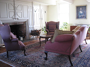 The paneling in the living room is new. Installed after the building was moved in 1987, it is an exquisitely rendered, line-for-line reproduction of the original, antique paneling in the bedroom above it. Because the fireplace is centered, the current owners followed convention and also centered their sofa, facing the fire. Alas, the entrance to the room is also on axis with the fireplace, so, instead of the paneling and the wideboard floors—two of the house's greatest assets— the first thing a visitor standing in the entry hall saw was the back of the sofa sitting on an oriental rug. Living Room After