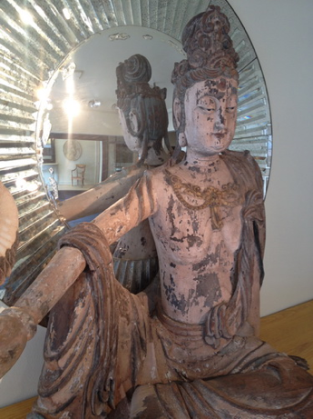 A seated Bodhisattva in front of a remarkable faceted mirror.