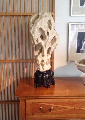 A Chinese scholar’s rock on a very smart "modern" Neo Classical fruitwood chest with a 1950s wood screen behind.