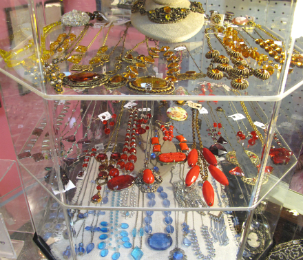 The store is a lot like her house, Meyer says. The pink walls and lace curtained entrance give the shop a charming, feminine feel, like a vintage life-sized dollhouse. The clothes help, too. Flattering and well-made dresses from the 1940s-1960s, in an array of colors and patterns, run from $65-$250. Vintage 1950s silk scarves ($10-$70), jewelry from the 1920s-1940s ($65-$120), and hats for women and men made in the years 1900-1960 ($35-$150) are hung on pegs, folded neatly in baskets and lovingly displayed in cases throughout the shop. The most expensive items are the evening dresses, which are perfect for fancy cocktail parties, weddings or proms. They run from $450-$600 and they are exquisite, made with intricate and extensive beadwork, fine satins and velvets, and quality period buttons. Not to be left out, men can find tuxedos and ties, along with winter coats for both sexes ($65-$100).