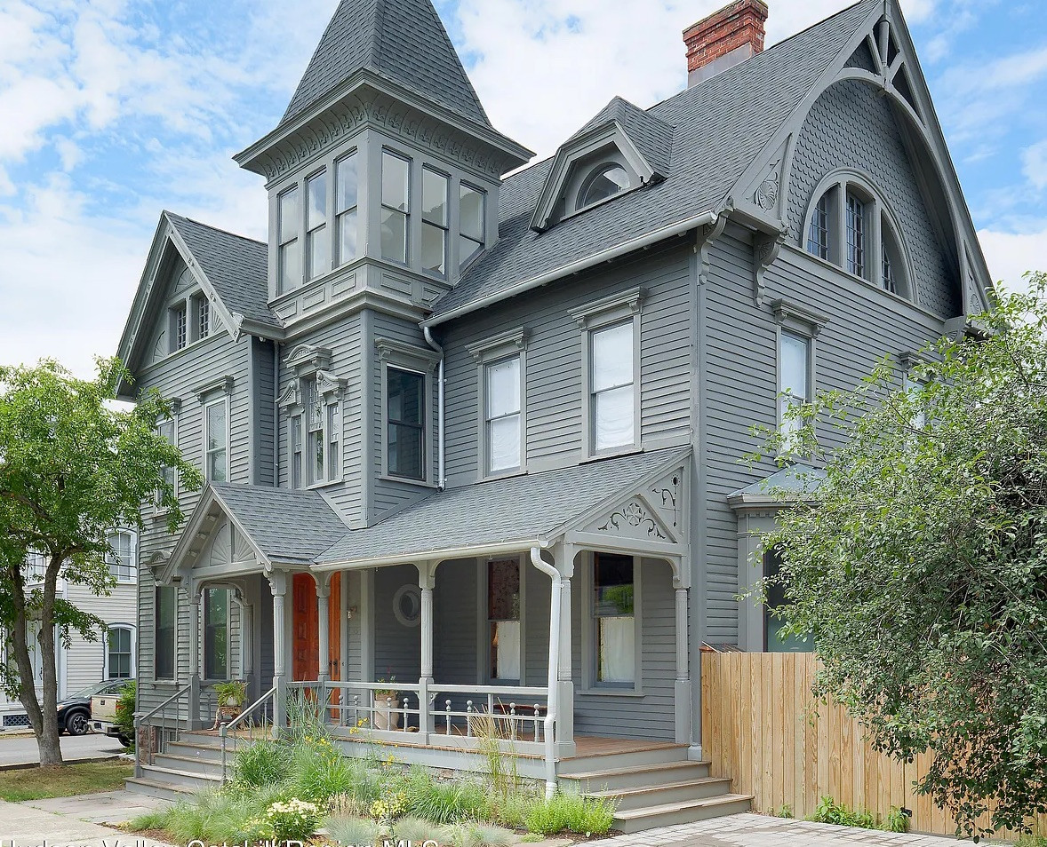 The house includes a formal dining room and parlors with period fireplace mantels, solid oak double doors at the entry, and energy-efficient windows throughout. The main bedroom features two walk-through closets and a private ensuite bathroom. A full third could be space for a studio, exercise room, or office, complete with a tower room that overlooks the neighborhood. There is also a covered side porch, a fenced garden area, and off-street parking for one car—quite a lot for such a tiny footprint.