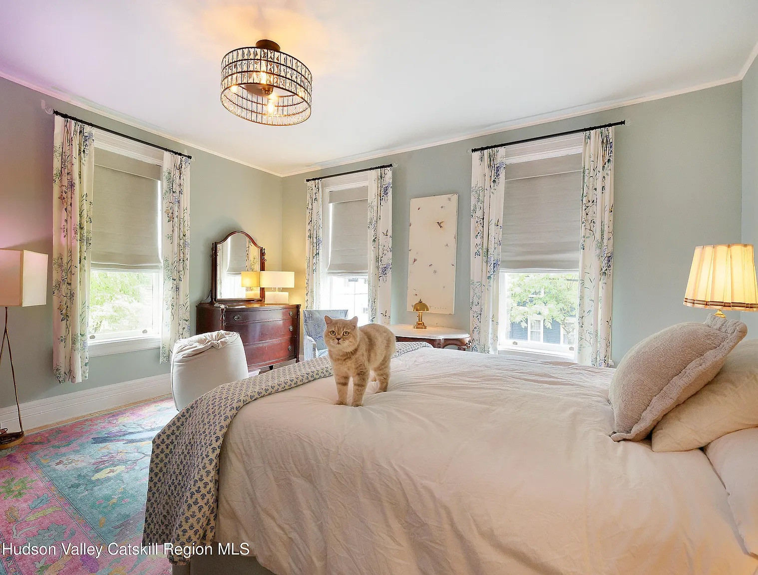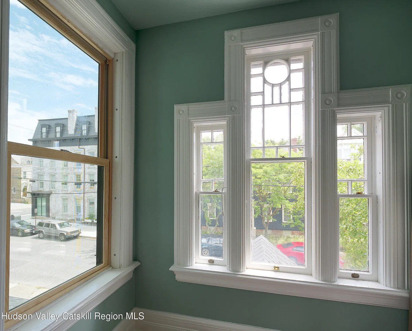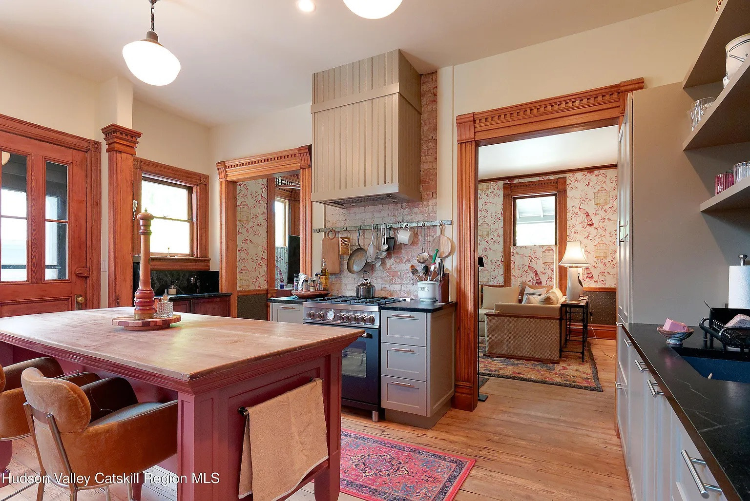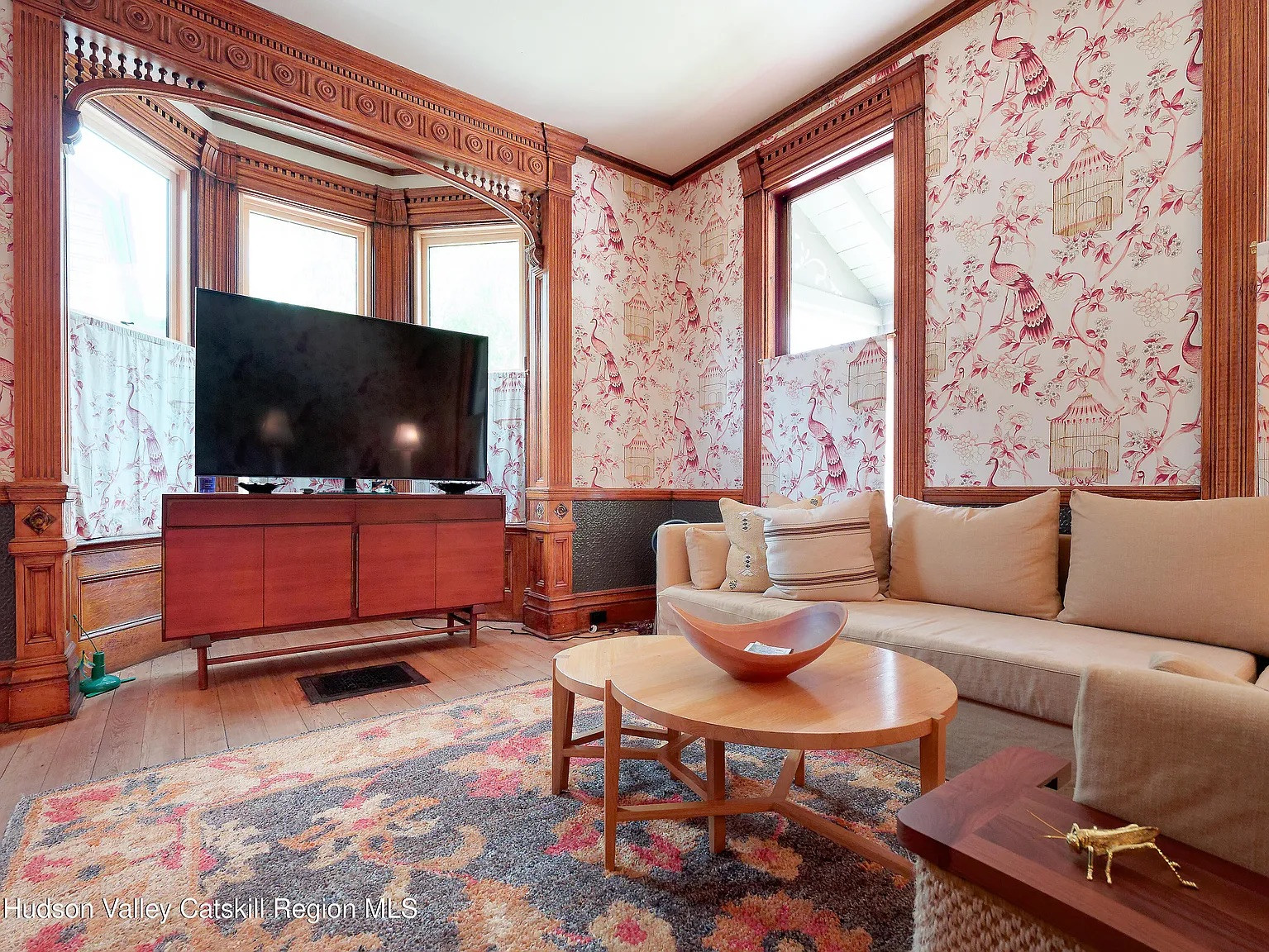 35 South Fifth Street in Hudson, is a three-bedroom, three-bathroom Stick Style Victorian home with 2,524 square feet of living space on a 3,049-square-foot lot—tight and right in town. Built in 1888, it’s got lovely original details like curved windows and ornate moldings and built-ins, many in original wood stain. It’s also got wallpaper that feels true to the period, like the red peacocks outside of their cages in the living room.