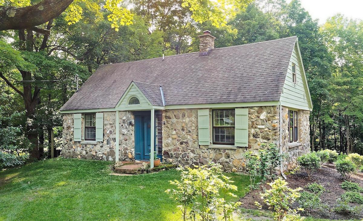 The Stone Croft cottages in Claverack, New York are two stone structures on 16 acres of woods and open glens. The two-bedroom, two-bathroom stone main house is an Arts and Crafts design with built-in benches, beamed ceilings, and an arched stone fireplace. Nearby, a stone studio used as guest space is lined with bookshelves and heated by a wood-burning stove. Outside is a new gunite inground pool and pool house surrounded by a sunny meadow and gorgeous gardens — all just 15 minutes to Hudson and Amtrak. Listed for $825,000 by HOUSE Hudson Valley Realty.