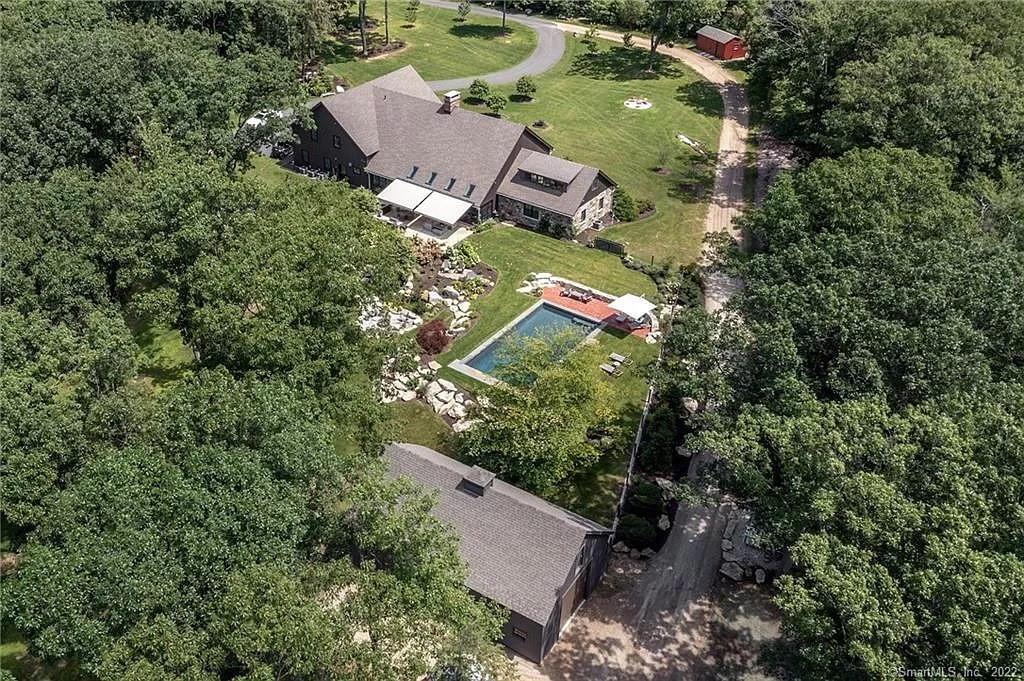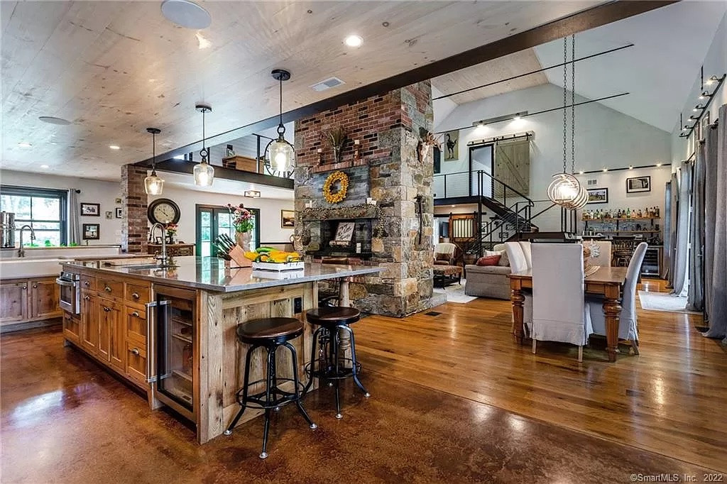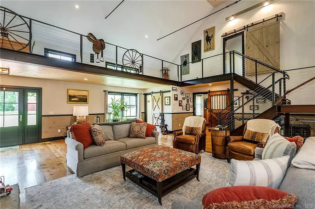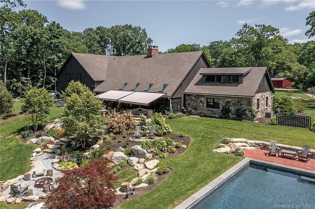 With open spaces inside and out, this modern barn-style home in Goshen has four bedrooms and three bathrooms on five-plus acres. There is a master chef's kitchen with a pantry, a catwalk, screened porch, patio with a summer kitchen (and Italian Tascome pizza oven), terraces, firepit, and saline pool. The heated garage has space for three cars. The south and west exposures promise great sunset viewing. Listed at $2,750,00 by William Pitt Julia B Fee Sotheby's International Realty.