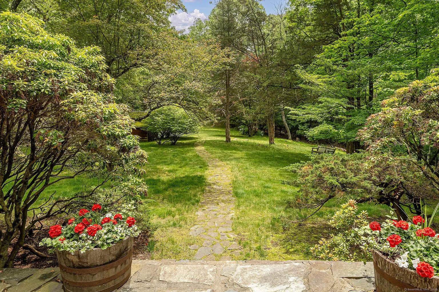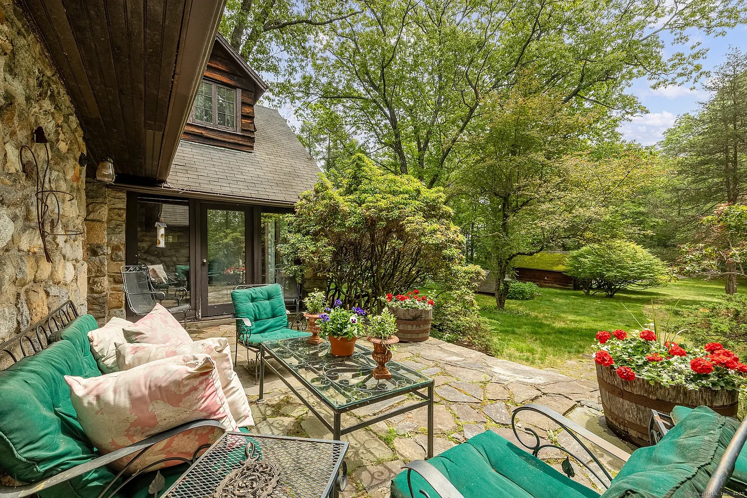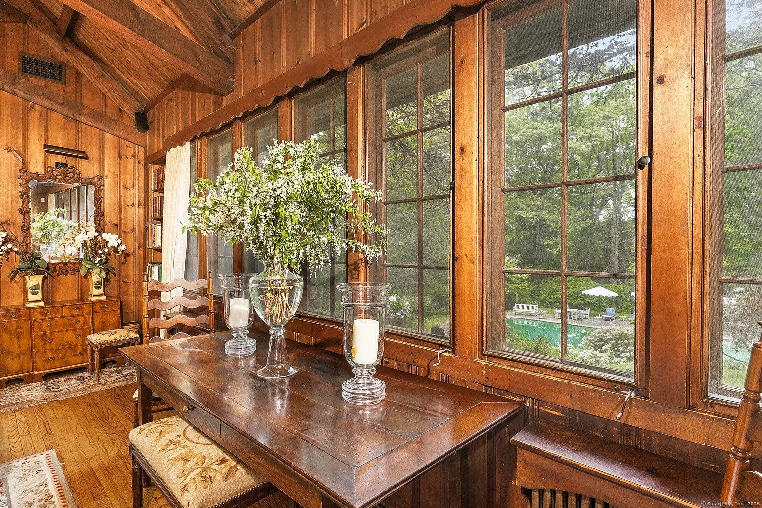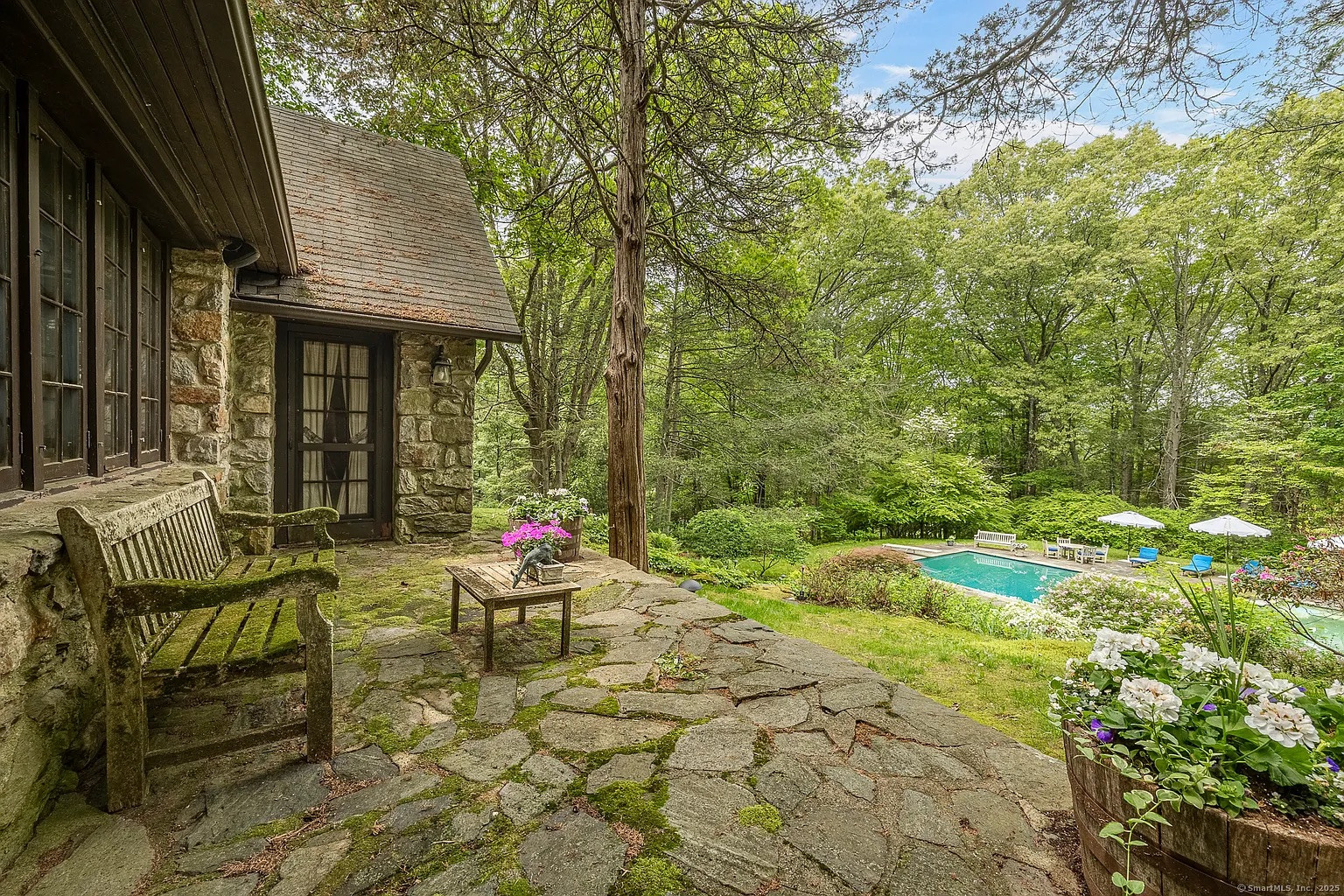 Inside, there’s honey-colored wood paneling, a floor-to-ceiling fieldstone fireplace and original oak floors, a dining room that opens to a lovely fieldstone terrace, and a butler’s pantry. It feels vintage but in a good way, with well-preserved quality finishes that harken back to an earlier time, maybe 1950 or 1960. Outside there’s a heated saltwater pool and a two-car garage, and the house has central air. Membership at nearby Candlewood Heights Beach Club offers water access.