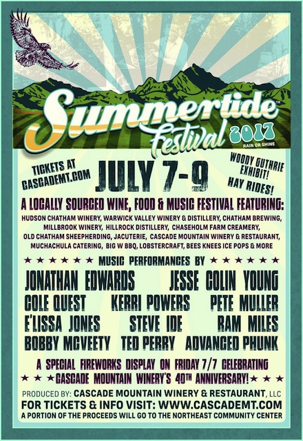 By Jamie Larson Live music, wine and food, all of the highest quality, enjoyed in a meadow overlooking the mountains…sounds like a dream. It also sounds like the Summertide Festival from July 7-9, at Cascade Mountain Winery in Amenia, New York. It feels a little like the setting of a fairy tale, down a winding dirt road, when Charlie Wetmore’s winery emerges around the bend. But it may feel even more surreal when you leave the quiet wood and emerge into the festival ground dotted with vendors from the best regional wineries, distilleries, breweries, restaurants and farms. And there's a stellar lineup of performers, too, including Sunday evening's headliners Jesse Colin Young, Jonathan Edwards, Cole Quest, Kerri Powers and many more. "It started with wanting to do something special for the winery's 40th anniversary, and it just grew from there," says Wetmore. "We want people to come here and think music."