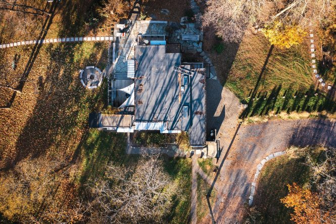 While sleeping in a tepee on his 10-acre Tivoli plot, Arnaud Cornillon dreamt of the home he would one day build there. It was an ambitious plan, incorporating seven 40-foot shipping containers and an additional 20-foot container. His design took cues from the lay of the land and the slant of the sun. Observing the changing light and seasons helped orient his home.