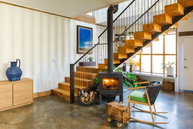 He initially planned for the staircase to ascend through the floor of an upper level container but the metal floor was too difficult to cut, so he separated the containers with an extension, creating a skylight that lets sun and starlight wash the space below.