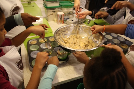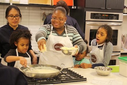 “Kids are picky eaters, so we create an environment where we expose kids to what hasn’t worked for them in the past,” says So. “The veggie mac and cheese is one the kids really like. It’s not just the veggies but the addition of a freshly made sauce, too. They see what goes into it. Also, because the class is six weeks, the kids really become confident in their skills.” The parents say they’re picking up some useful new skills and recipes but are also just pleased to see their kids so engaged and eager to cook. “She’s really been enjoying the new types of food we’ve been making,” father and EMT William Mackey says of his daughter, as she busily stirs the batter for banana chocolate chip muffins. “We’ve already started eating healthier at home. This makes me much more aware of our options and we’ve learned some new techniques.”