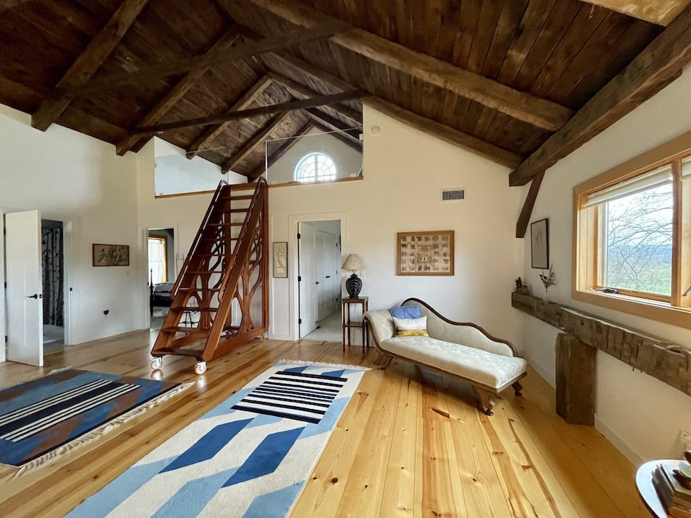 An 1800s hand-hewn barn was relocated to Copake from the Adirondacks and became this spacious home with four bedrooms, four bathrooms, and a loft space. The award-winning landscape is filled with wildflowers and stonework. The detached garage has a breezeway and heated path to the house. The property encompasses 14.8 acres. Listed at $1,995,000 by Scot Cohen Realty.