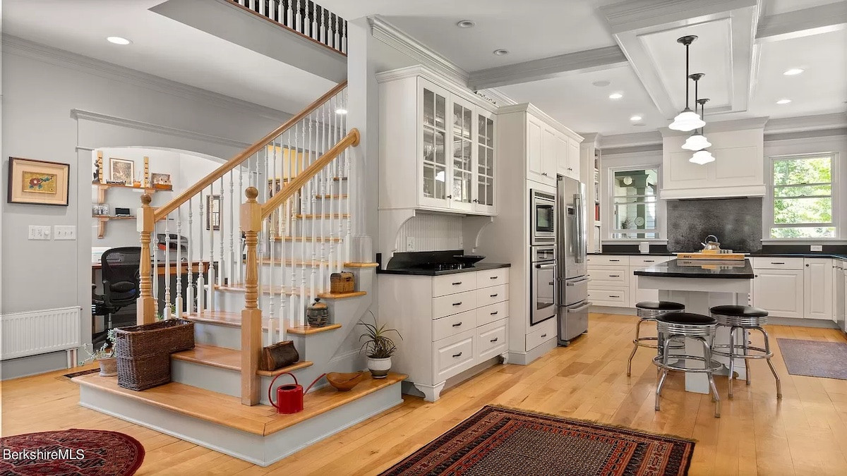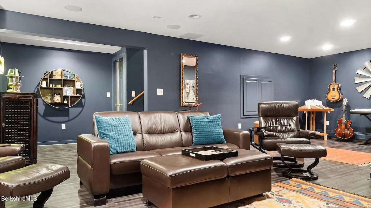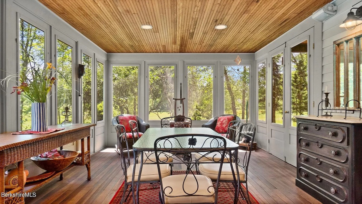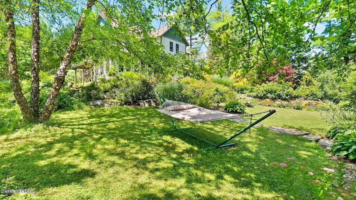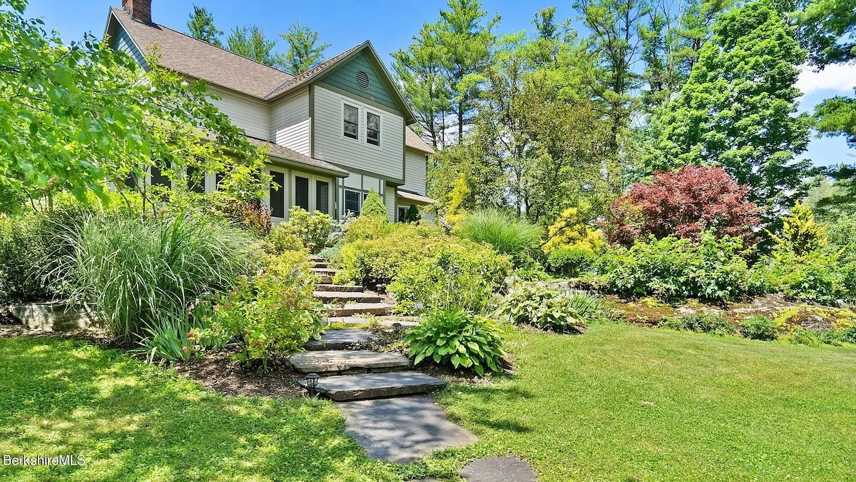 In Lenox, this home is directly across from Tanglewood, yet set back among three acres of lush, mature gardens for privacy. It has four bedrooms and three bathrooms, an open-concept floor plan, chef's kitchen with new appliances, oversized screened-in porch, and a newly renovated lower-level family room. Solar panels cover the electric for the house. Listed at $1,399,999 by William Pitt Julia B Fee Sotheby's International Realty.