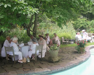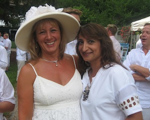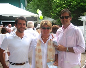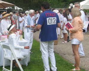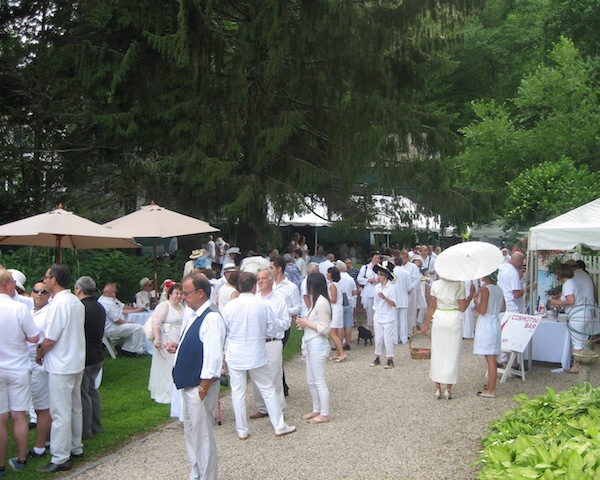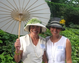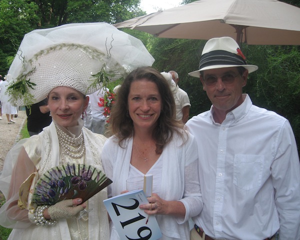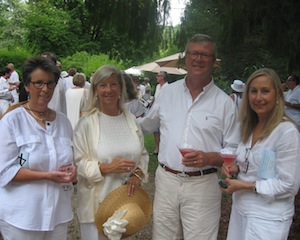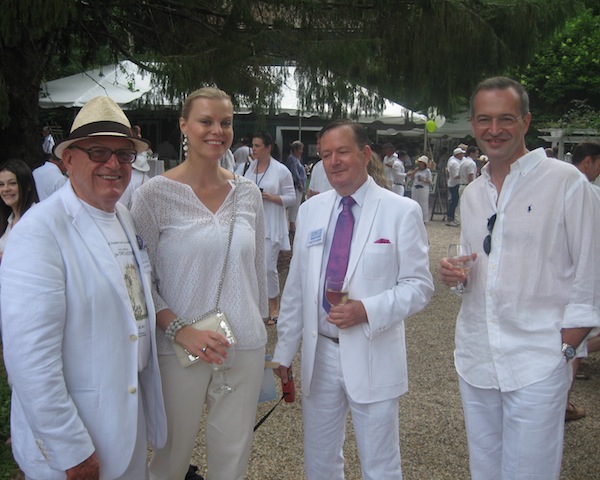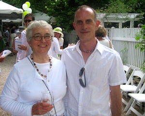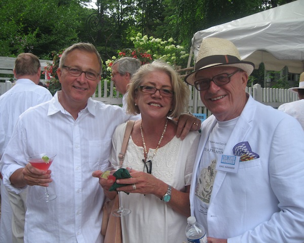Rachel Louchen reports from Washington, CT. The invitation said Two For Two Hundred, but from host Gael Hammer's estimate, a more accurate title would be Tea For 350. On Saturday, August 8, the 18th annual Tea For Two Hundred, to benefit the Interfaith AIDS Ministry of Greater Danbury and New Milford Visiting Nurse Association, was held in the gardens of Gary Goodwin and Gael Hammer. The nonprofits offer critical support to the community — and the community came out to return the favor. The large grounds comfortably accommodated the 350 guests, all clad in white attire. The various entertainment areas featured live music from Christine Ohlman, a silent auction, dancing, sit-down dining and book signings from Honorary Chair Candace Bushnell and special guest Larry Kramer. In addition to the mandatory white garb, the hat contest was taken very seriously, with large and flamboyant headgear standing out in the sea of white. Above, host Gael Hammer, Claudia Kozma Kaplan, senior vice president at Christian Dior, host Gary Goodwin and Vladimir Kaplan.