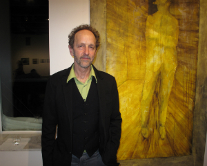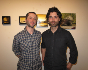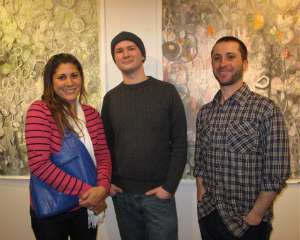 Douglas Paisley in front of one of his Ten Spot pieces; Celeste Cano, Andy Rock, and Peter Gordon pose near Gordon's work.