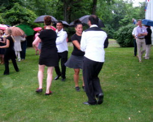 Dancers from the Dojo Dance Company mambo on the lawn between the raindrops; Christine Kulander and David Sprouls.