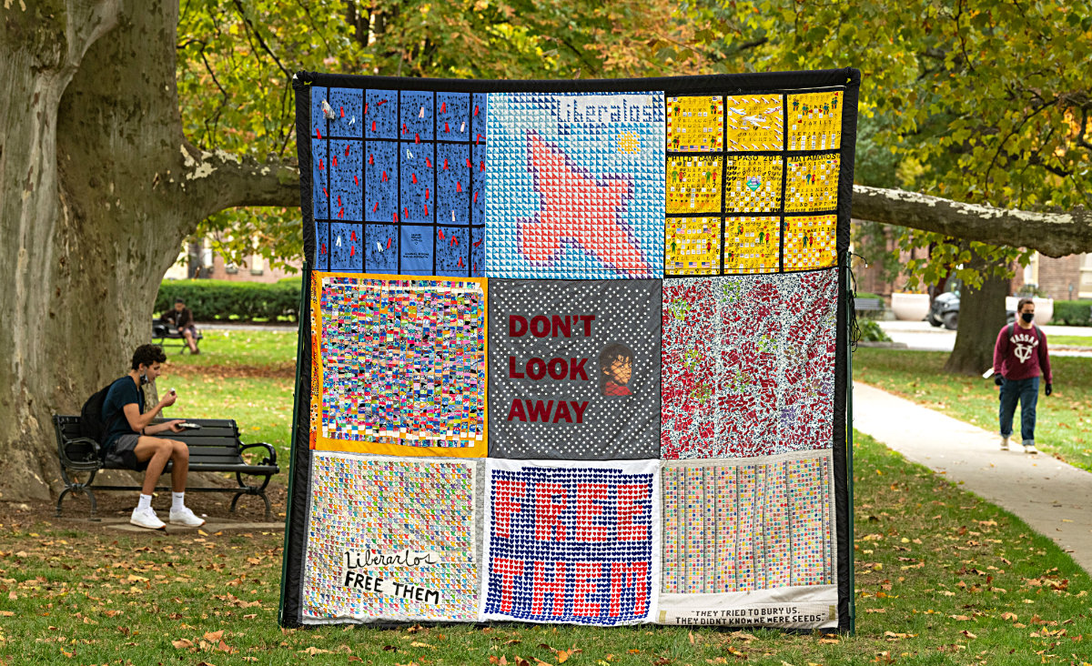 After a stint in New Hampshire, the pieces traveled to Vassar College, where they were displayed on the library lawn and the Loeb Art Center Sculpture Garden. Valerie Carlisle from the New York grassroots group Grannies Respond/Abuelas Responden had inquired whether the Consortium on Forced Migration, Displacement, and Education at Vassar (funded by the Andrew W. Mellon Foundation) might be interested in displaying the quilts on campus. Tom Pacio, from Vassar's Frances Lehman Loeb Art Center and Creative Arts Across Disciplines, and Geography Lab Coordinator Richard Jones organized the move from New Hampshire and the display at Vassar and throughout Poughkeepsie, including at the Family Partnership Center and Christ Episcopal Church. The quilts are back on Vassar’s campus until Nov. 9, after which they travel to Bard College. The quilts will also be shown at the Glebe House and the Trolley Barn later in November.