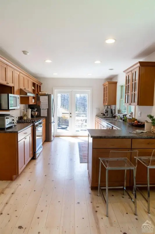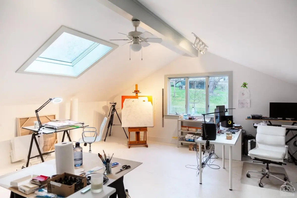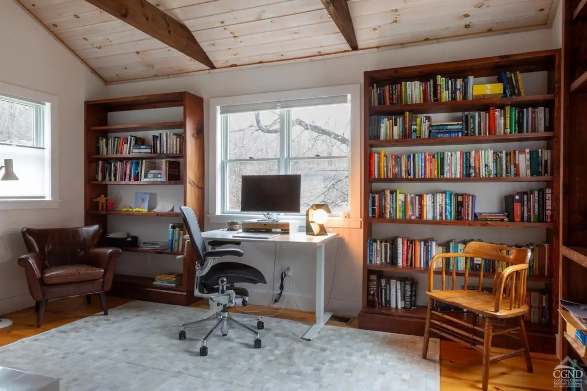 A contemporary home custom built in 2005 sits on three acres in a country setting in Ancram. Off the living room are two private en-suites, one with a loft space, the other with its own sitting room/home office. The large two-car garage offers a work bench area and an EV car charger; upstairs is a spacious artist's studio. Listed at $629,000 by Houlihan Lawrence.