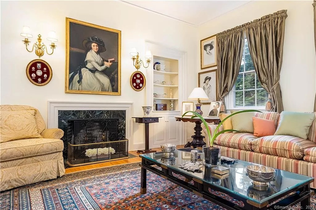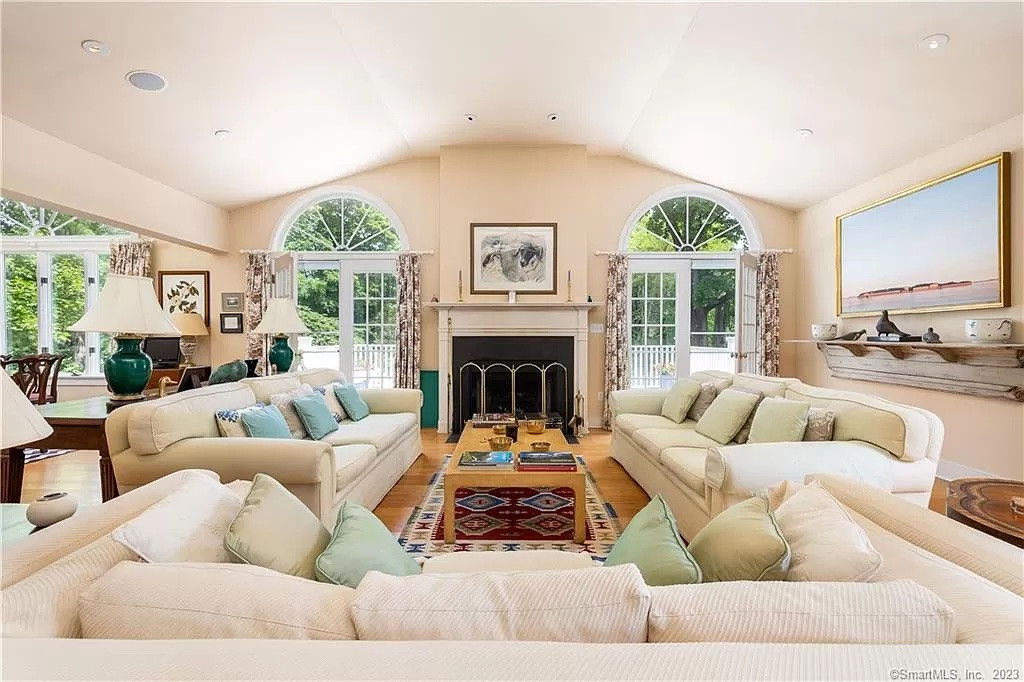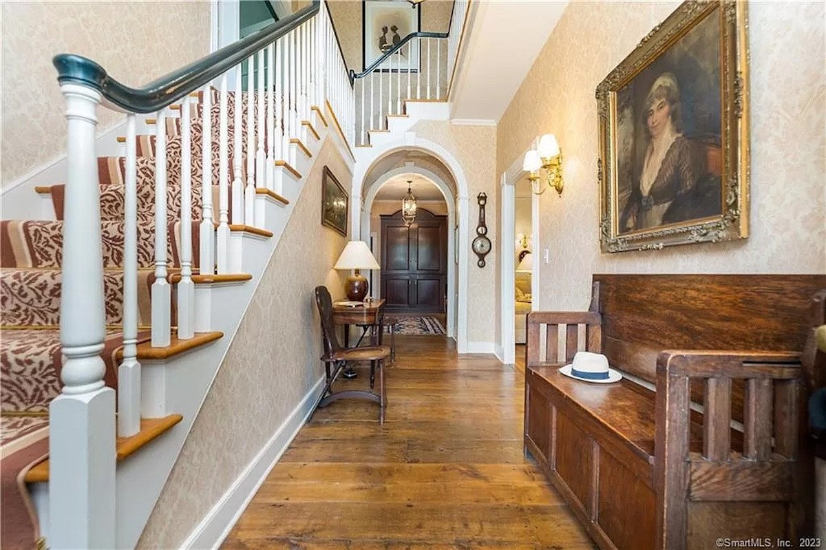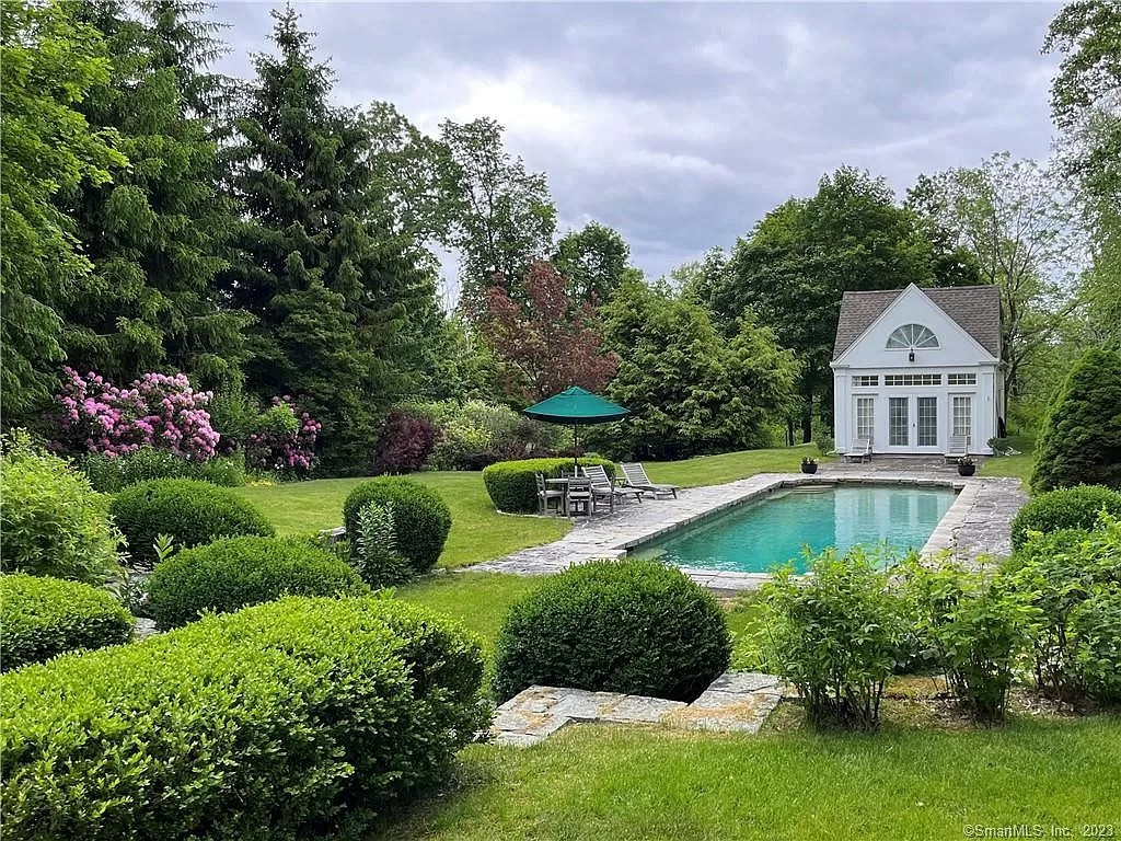 Built in 1830, the Col. Charles Webb house sits on two acres in historic Litchfield. It has four bedrooms and five bathrooms, an elegant formal living room with wood-burning fireplace, a chef's kitchen with wine cooler and breakfast bar, and a massive great room with vaulted ceiling. An attached two-car garage is located under the house, and there is a heated pool and a one-bedroom guest cottage. Listed at $1,695,000 by William Pitt Julia B Fee Sotheby's International Realty.
