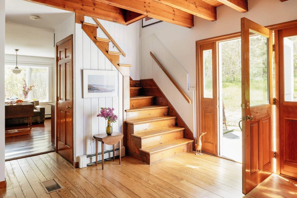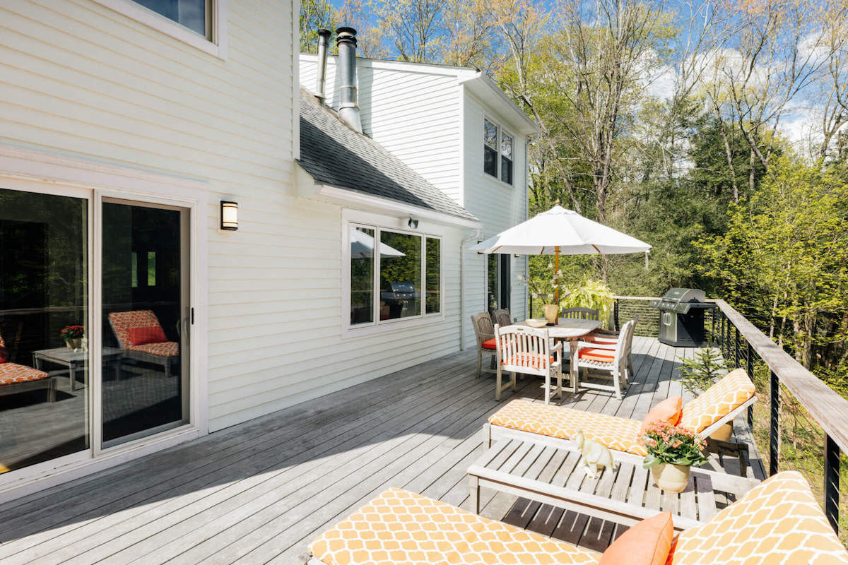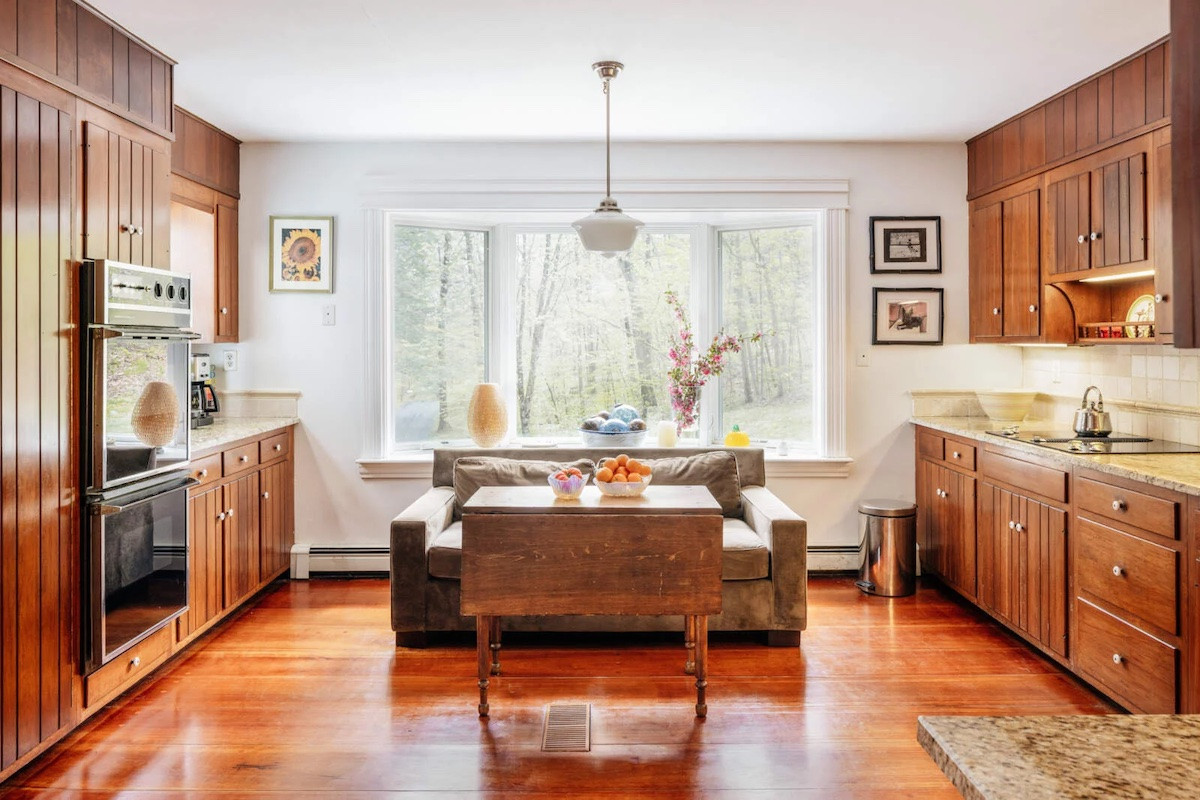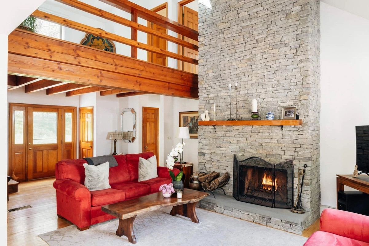 Stairs ascend past perennial gardens to a bluestone patio at the front door of this home in Red Hook. It has three bedrooms and two bathrooms, a living space with a double-height stone fireplace, and a large kitchen with granite countertops. Picture windows offer views of the stream and surrounding grounds. Listed at $825,000 by Rouse + Co. Real Estate.
