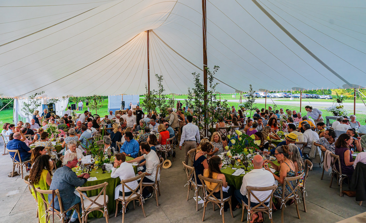 You could say that PS21 (Performance Spaces for the 21st Century) founder and philanthropist Judy Grunberg was there in spirit at the nonprofit’s Gala in the Orchards this past Friday, Aug. 5. You could also say she was there in spirits, as the evening’s signature vodka-lemonade cocktail (The Judy, complete with edible nasturtium flowers as a garnish) was served in her honor. Dinner, a silent auction, and remarks were held under a tent in the PS21 orchards. Potted apple trees brought the outdoors in, serving as décor inside the tent and doubling as a popular auction item that was ready to bring home. A premiere by the Mark Morris Dance Group in the open-air pavilion theater followed dinner, and preceded a coffee and dessert reception inside the black box theater. The gala raised funds to support PS21’s free and low-cost community programs and education initiatives, the artists who create innovative works at the site, and the preservation of its 100-acre landscape.