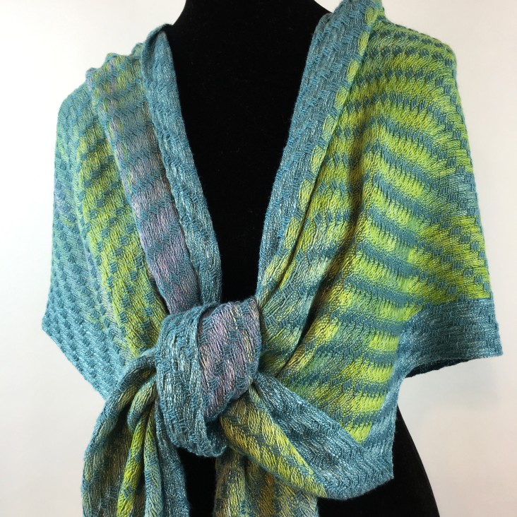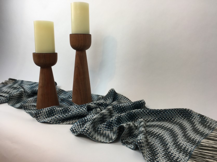 Most of what I do are functional pieces, either wearable —shawls, scarves, ponchos — or table linens. Right now I’m doing a commission of dish towels for a client who specified a certain color. Everybody asks me how long a piece takes, but I’ve never really kept track. I’d say anywhere from 15-30 hours for a larger piece. That includes setting up the loom, the weaving, the finishing — which could involve sewing, or braiding the fringe — and put through some kind of washing process.
