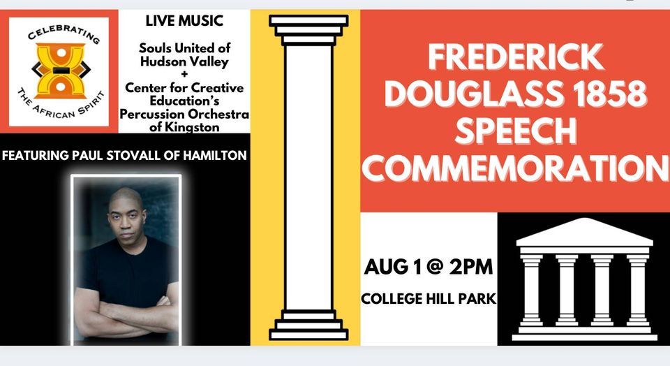 The August 1 event came together quickly only recently. Word was getting out that we’d found this speech, and Paul Oakley Stovall, who’d been playing George Washington on tour with “Hamilton,” turned his attention to studying Frederick Douglass during the pandemic. He was part of the New York Stage and Film’s partnership at Marist and Vassar, and when he found out that the speech had been discovered, suggested that he could perform it at College Hill, where the speech took place. Douglass actually spoke for three hours, but Paul’s going to turn it into a (shorter) performance. The afternoon will start with a procession around the College Hill Park Pavilion by Souls United of Hudson Valley, and the Center for Creative Education’s Percussion Orchestra of Kingston.